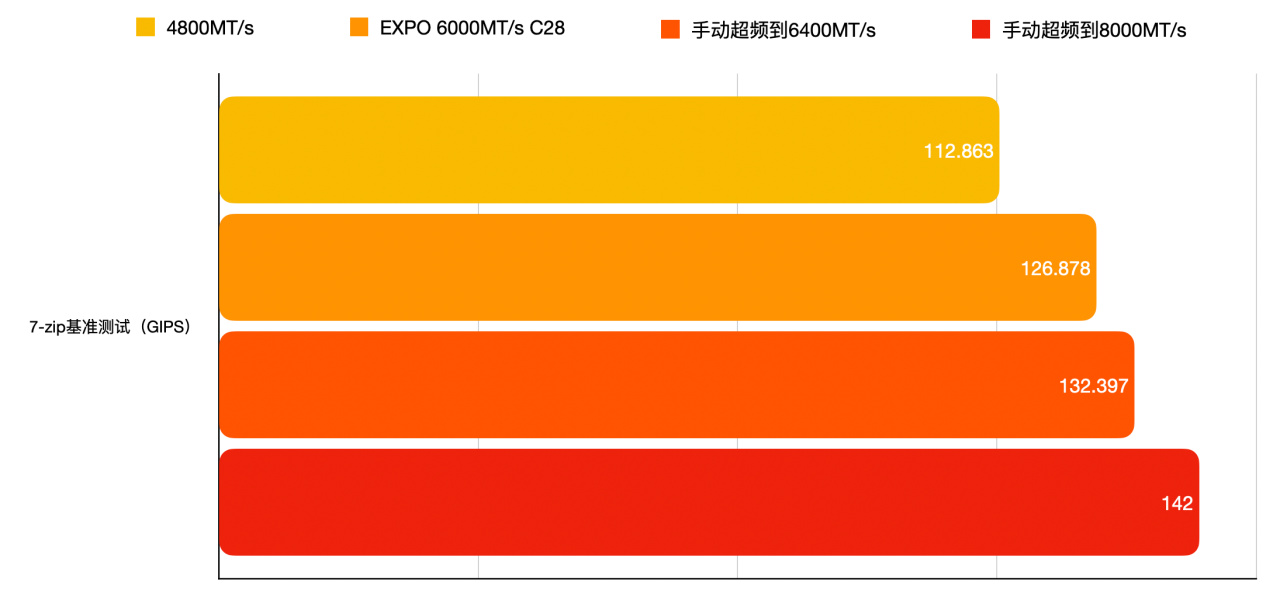 生產力測試中,7-ZIP基準測試得分126.878 GIPS,相比4800MT/s提升了12%以上,提升幅度還是很顯著的。