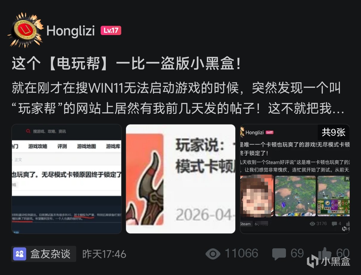 昨天我們查資料的時候發現了一個叫【電玩幫】的網站一比一盜版了我在小黑盒發的很多文章。