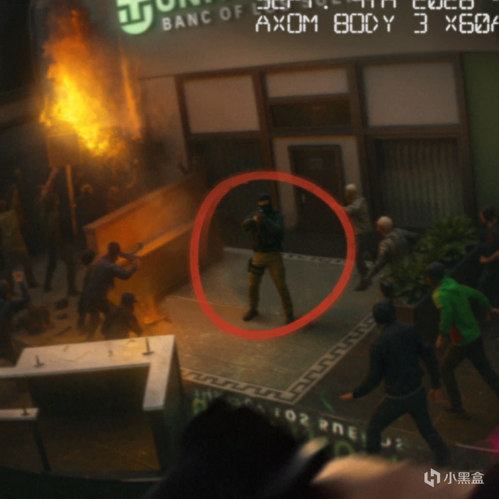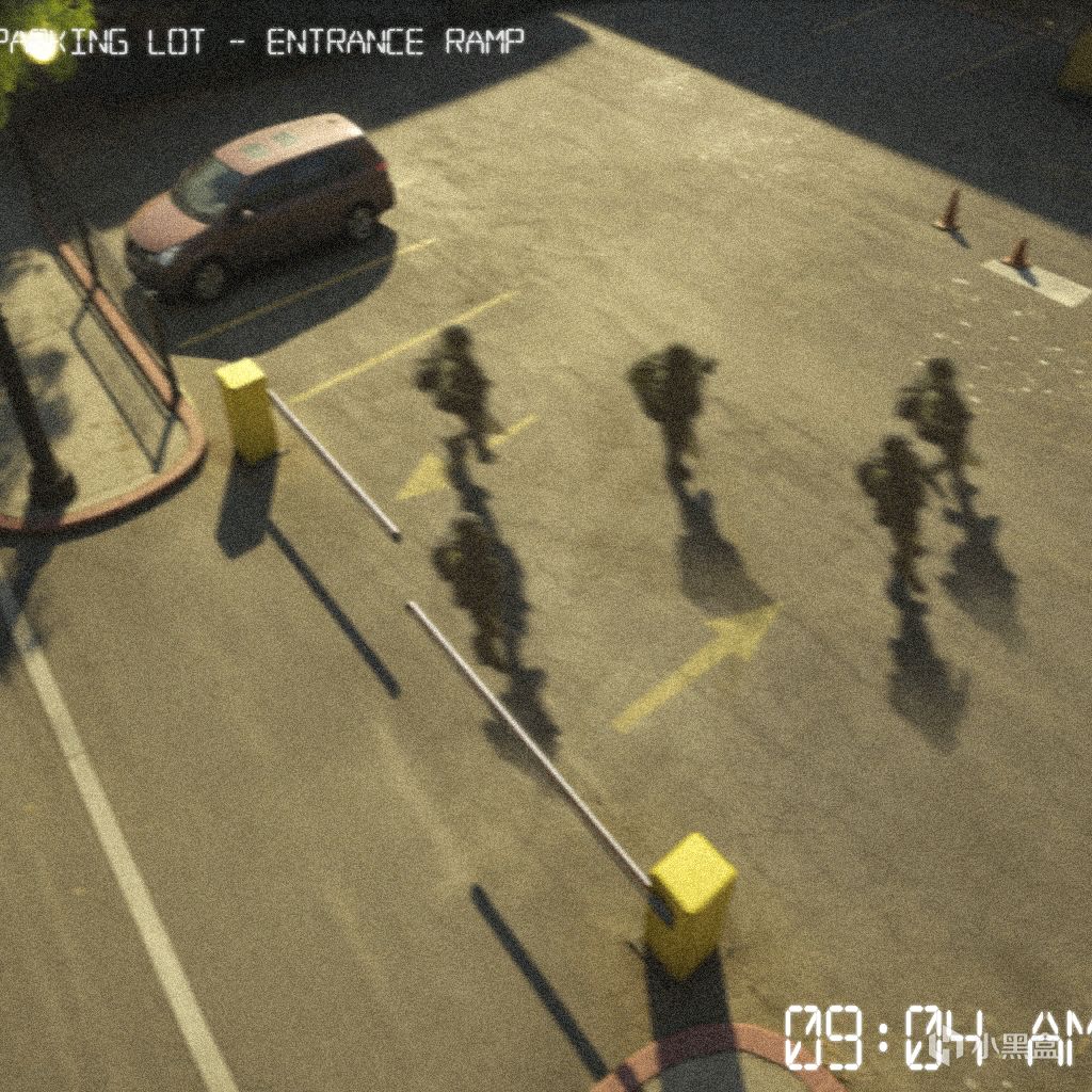第二段監控視頻攝於上午 09:00 左右,畫面中有一隊無標識貨車車隊駛入了同一地下匝道。錄像抓拍到正在控制入口的黑色哨兵特工。片刻後,畫面出現失真,並進入循環播放狀態。這表明有人爲了掩蓋完整潛入過程,篡改了系統。