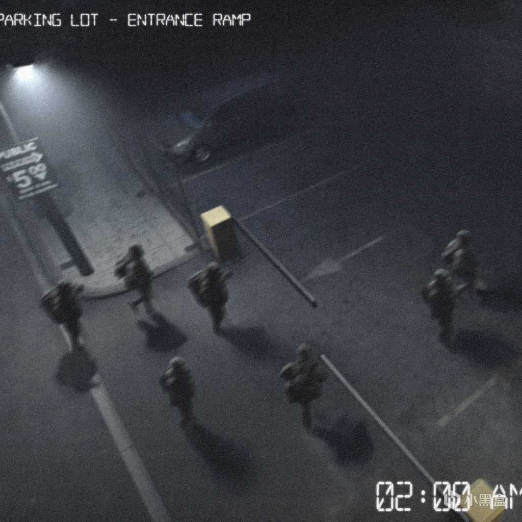 這份材料由銀行地下辦公室的一位匿名人員提供,錄像時間戳爲 02:00,畫面中的蒙面人通過停車場的入口匝道進入。共識別出兩組人員,其中一組已確認爲黑色哨兵。實時畫面在被人爲清除前已轉爲雪花噪點。