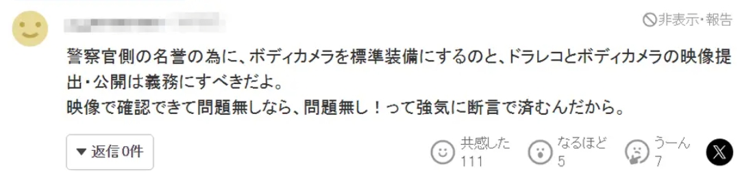 爲了維護警察一方的名譽,應該把執法記錄儀(隨身攝像頭)列爲標準裝備,並且強制要求提交、公開行車記錄儀和執法記錄儀的影像。