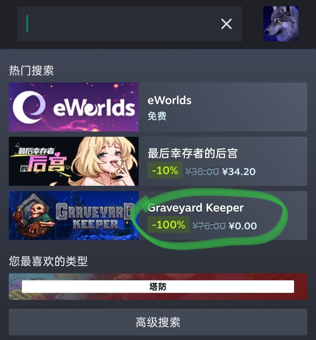 领取方法很简单,打开steam在搜索栏那里点一下就可以看到了,第三个画圈这个这个-100%的就是了