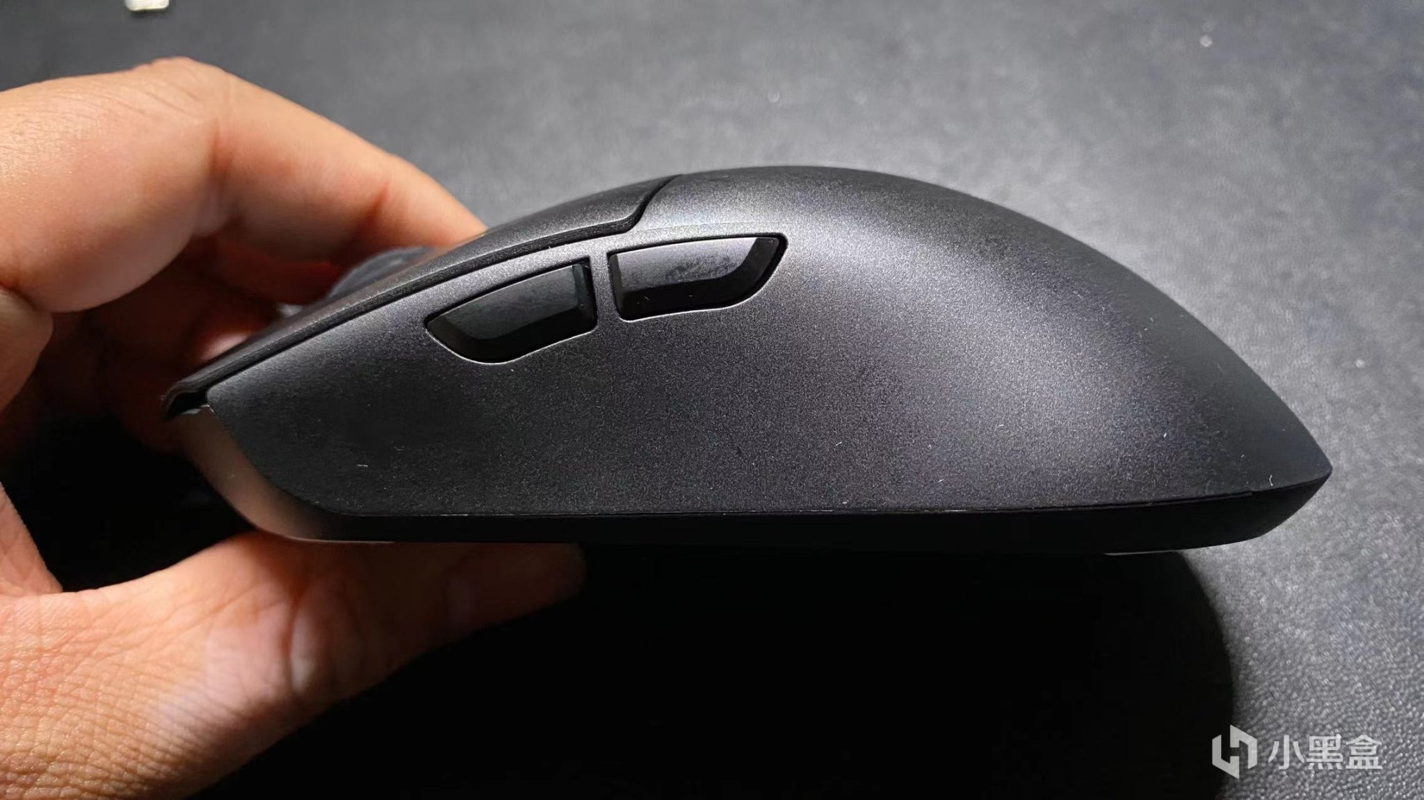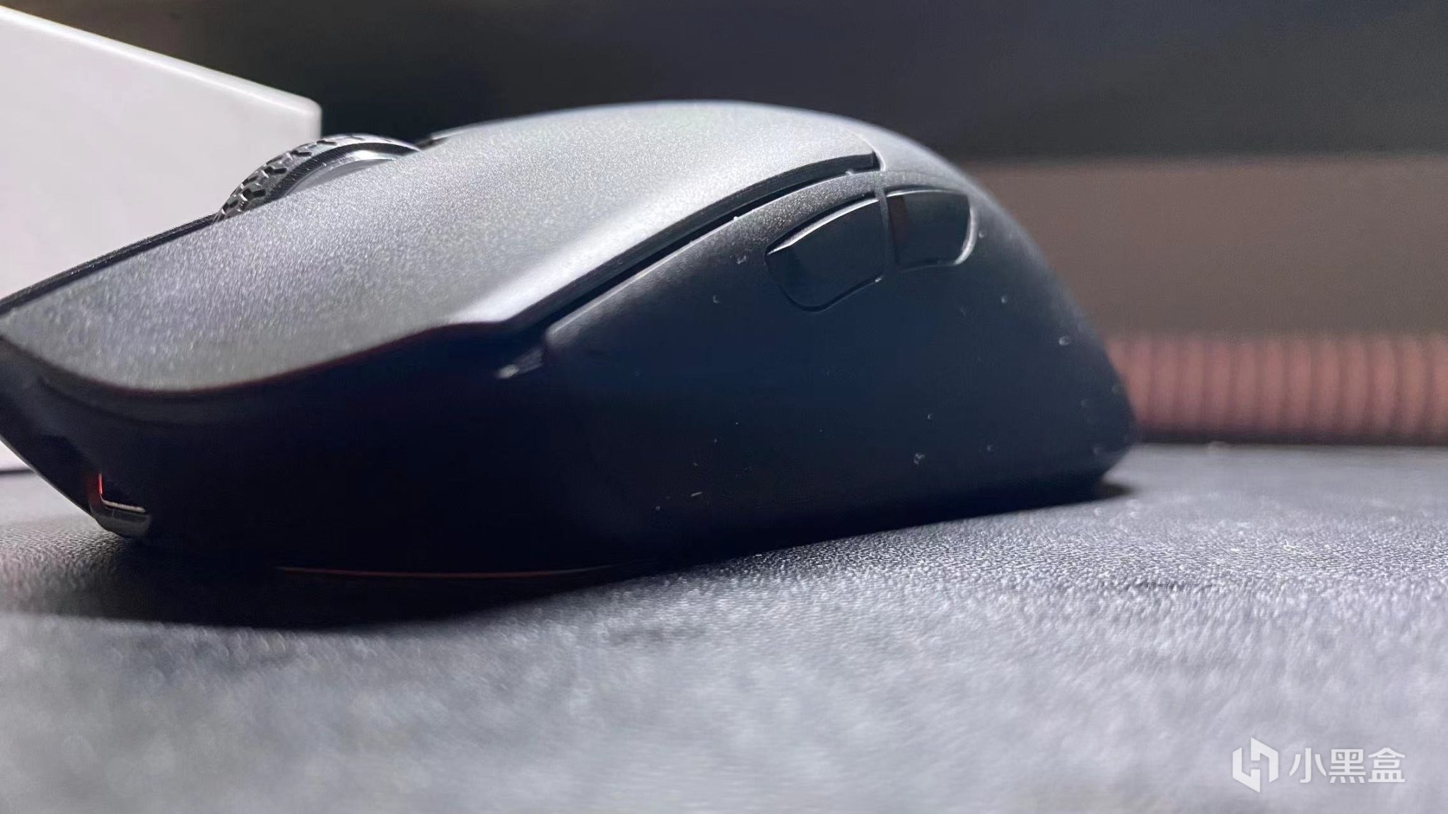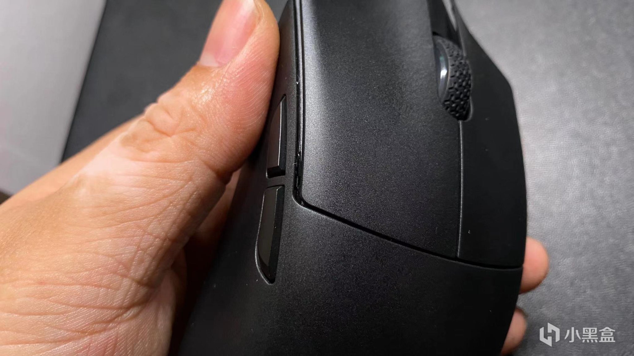 因为鼠标为了追求轻量,所以按键上盖做的比较薄,导致了侧键漏出来了 一点点(但是贴上防滑贴是看不见的)这里是我个人感觉比较遗憾的一点。