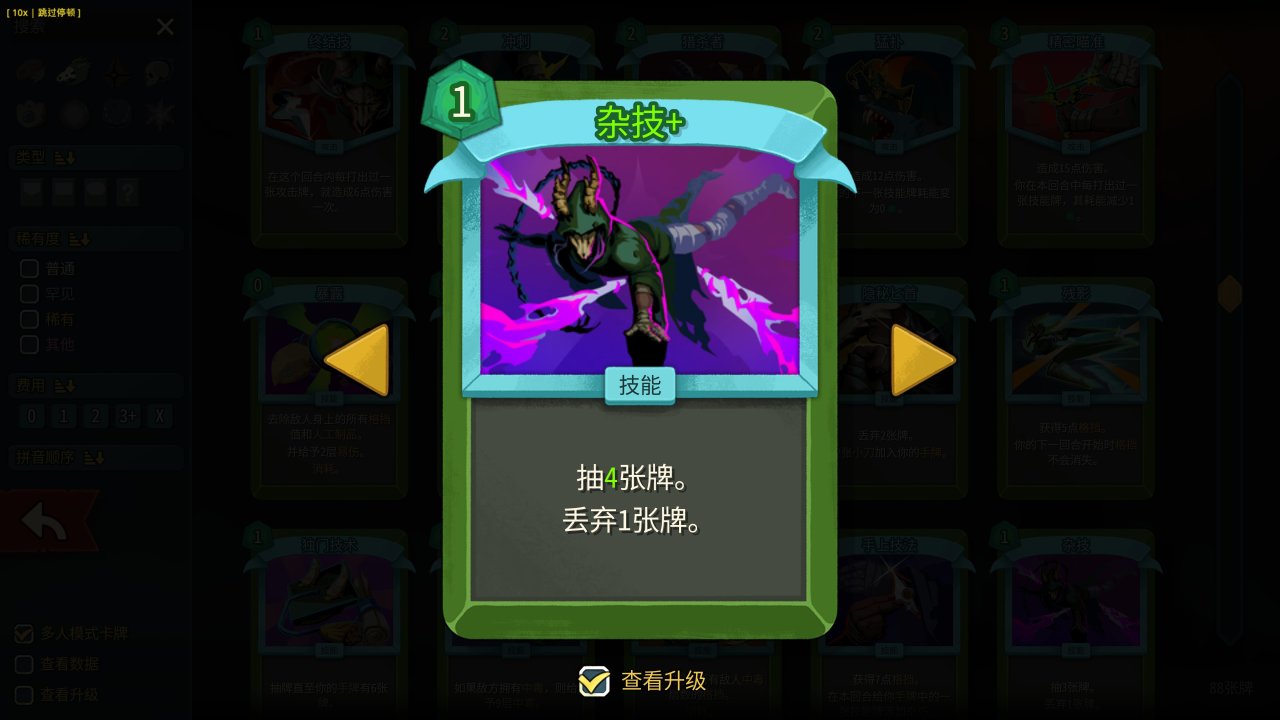 雜技作爲普通卡一直強度超標,勝率與選取率碾壓同類型卡牌(略讀、解析、微光、燃燒契約),也是其中唯一一張普通卡。