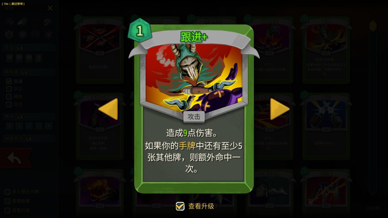 新:普通攻擊牌,消耗 1 點能量,造成 7(升級後 9)點傷害;若手牌中另有 5 張及以上卡牌,額外攻擊一次。