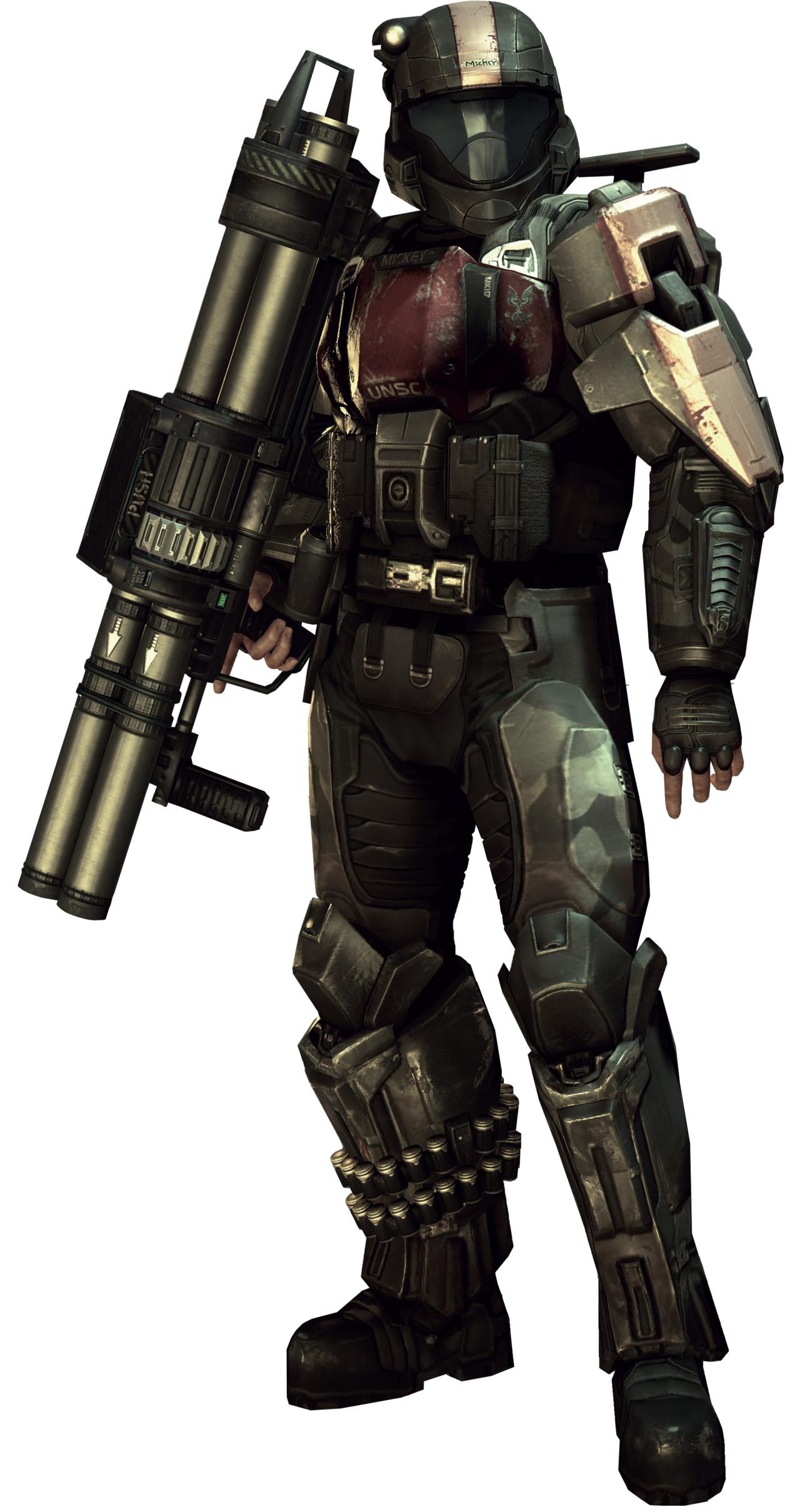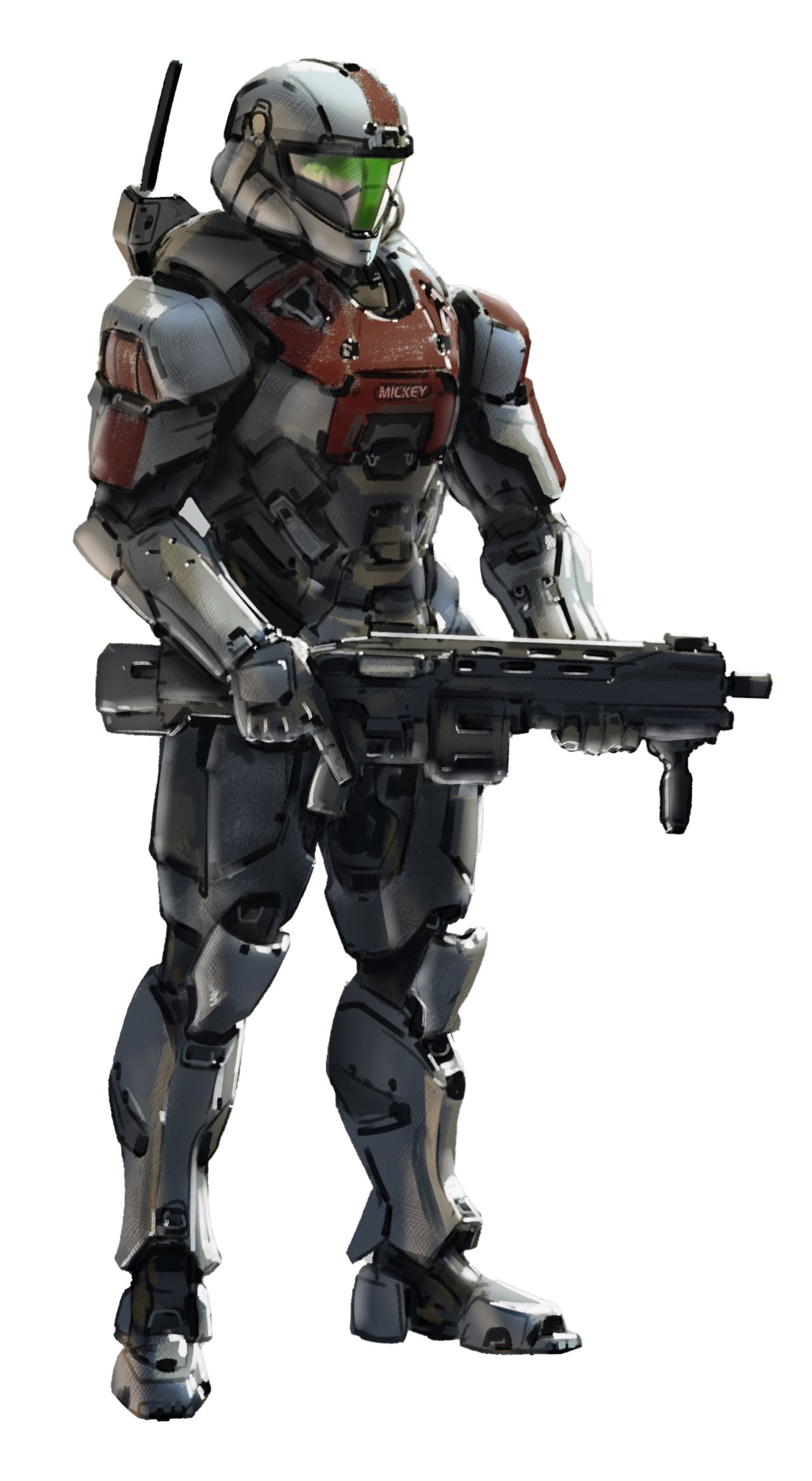 不久後,米奇憑藉卓越的表現,被選拔進入軌道空降突擊部隊——那支令敵人聞風喪膽、令戰友心生敬畏的ODST,地獄傘兵。這支部隊是UNSC的精銳之師,每一名成員都需歷經煉獄般的淬鍊,方能褪去青澀,佩戴上象徵榮耀的ODST護甲。對米奇而言,成爲ODST,是一份沉甸甸的認可,更是一份遲來的歸屬感。他身着配有紅色裝飾件的ODST UA型護甲,左肩護甲較標準尺寸更爲厚重,腿部纏繞着霰彈槍彈殼串聯的彈藥帶,頭盔上安裝着遠程傳感模塊,還貼着一塊寫有“米奇”二字的膠帶——這是他的標識,是他對自己身份的確認,更是他心底那份渴望被看見的倔強。