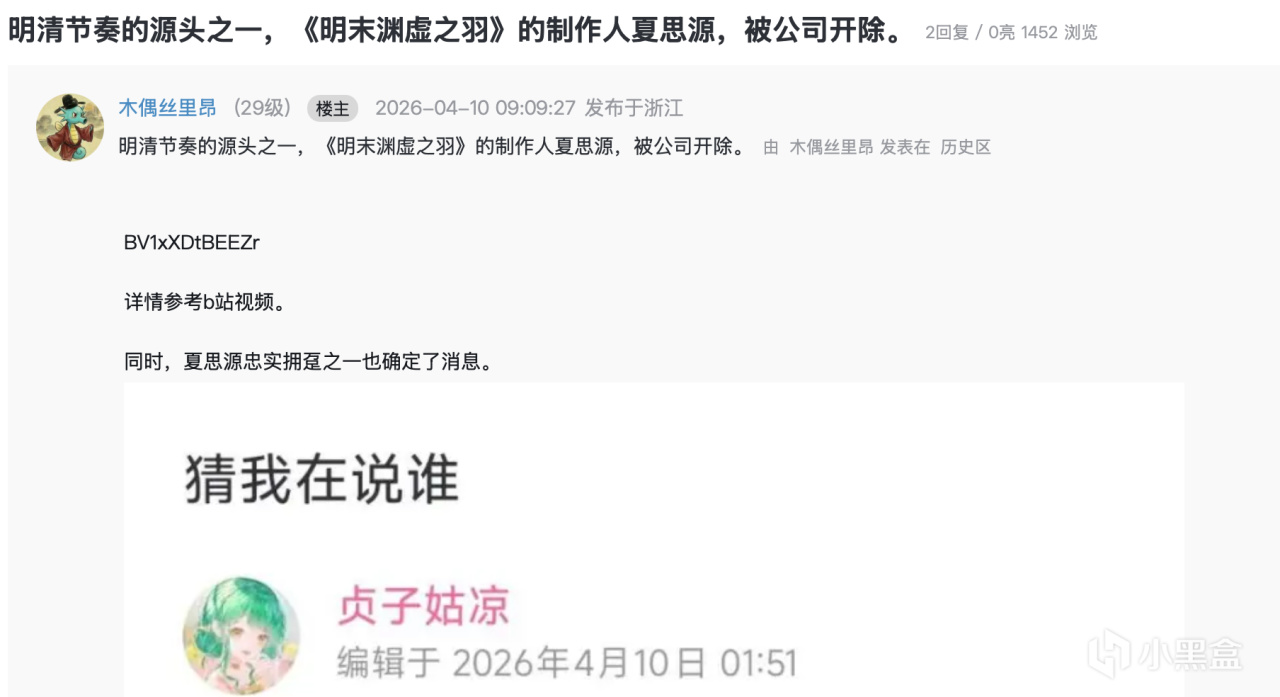 2026年4月10日,虎扑社区网友“木偶丝里昂”发布帖文称,“明清节奏的源头之一,《明末渊虚之羽》的制作人夏思源,被公司开除”。