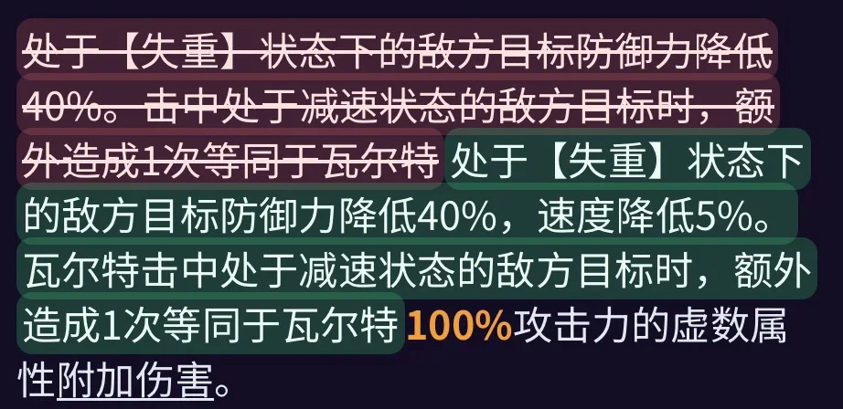 我方目标攻击【失重】状态下的目标时,造成的伤害提高6%,该效果最多叠加15层,持续2回合。战斗开始时瓦尔特恢复30点能量。
