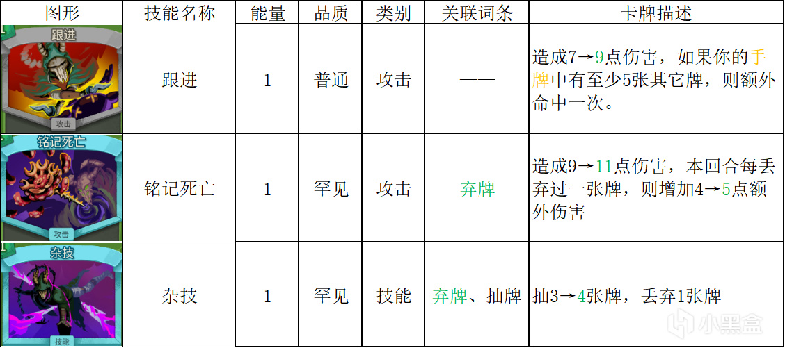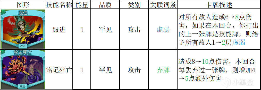 跟进的稀有度进行了调整,从罕见变为普通牌,效果也进行了重做。也是解决触发方式比较繁复的问题。铭记死亡伤害进行了上调,从8(10)提升为9(11)。
