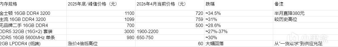 以主流32GB DDR5套裝(16G×2)爲例,其價格從3月中旬的接近3000元高位,迅速回落至4月初的2200元左右,單月跌幅高達27%。