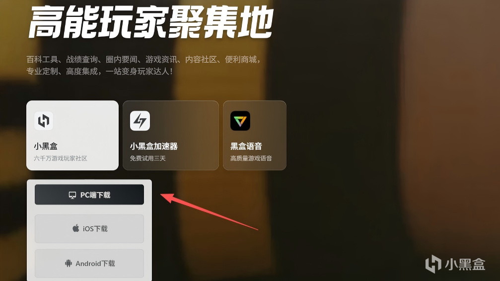 首先我们需要下载小黑盒 PC 端,进入网页:https://www.xiaoheihe.cn/home,在“高能玩家聚集地”几个字的下方,鼠标移动到第一个图标上,选择“PC 端下载”(注意区分小黑盒和小黑盒加速器,两者不相同):
