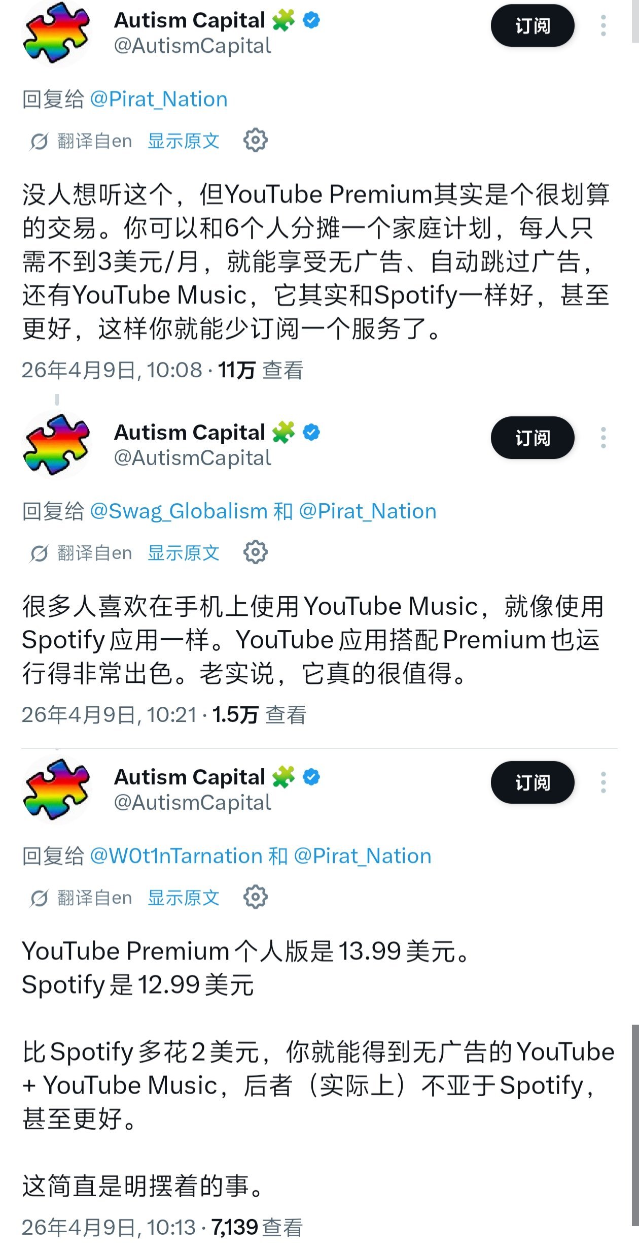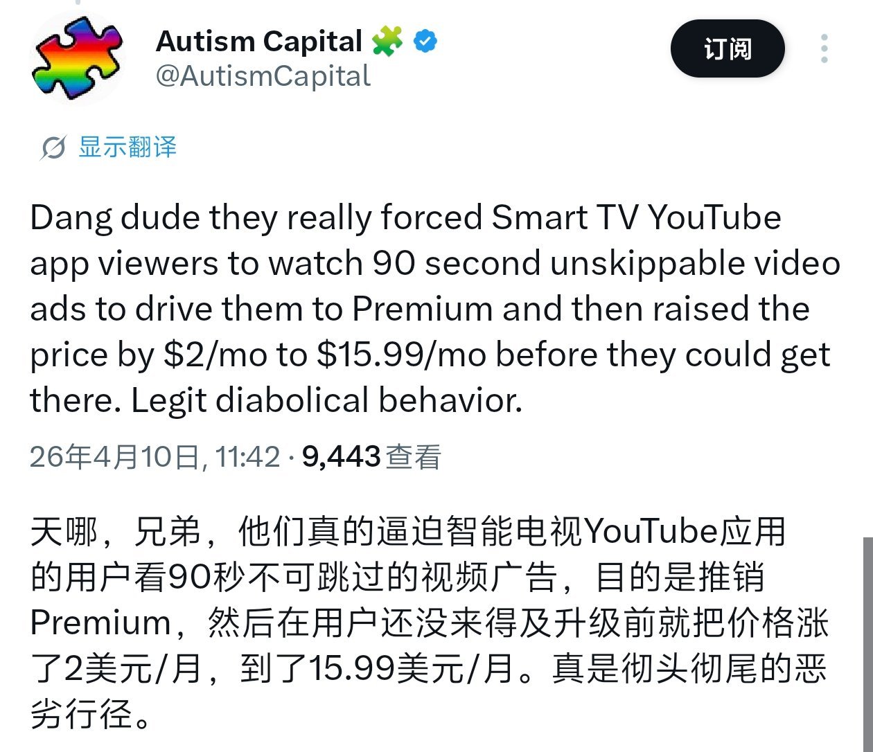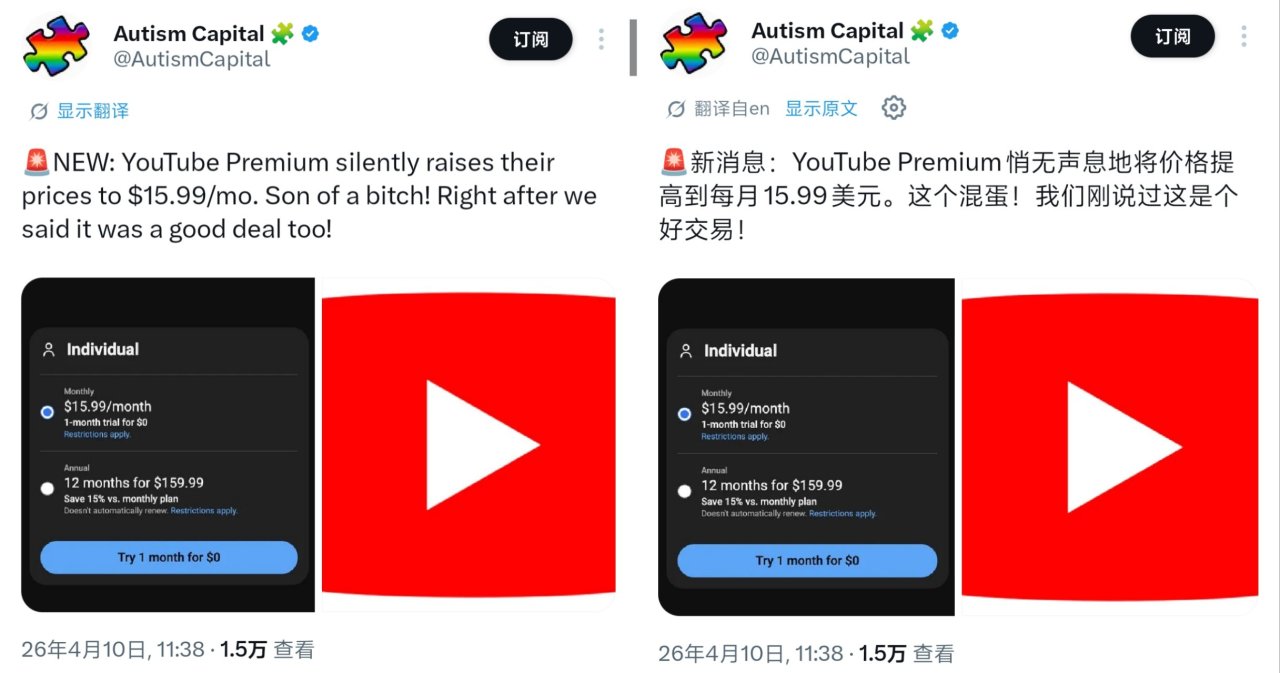 就在今天,老哥再次發文,稱油管這個混蛋,剛誇完他會員價格值,他就漲價太混蛋了: