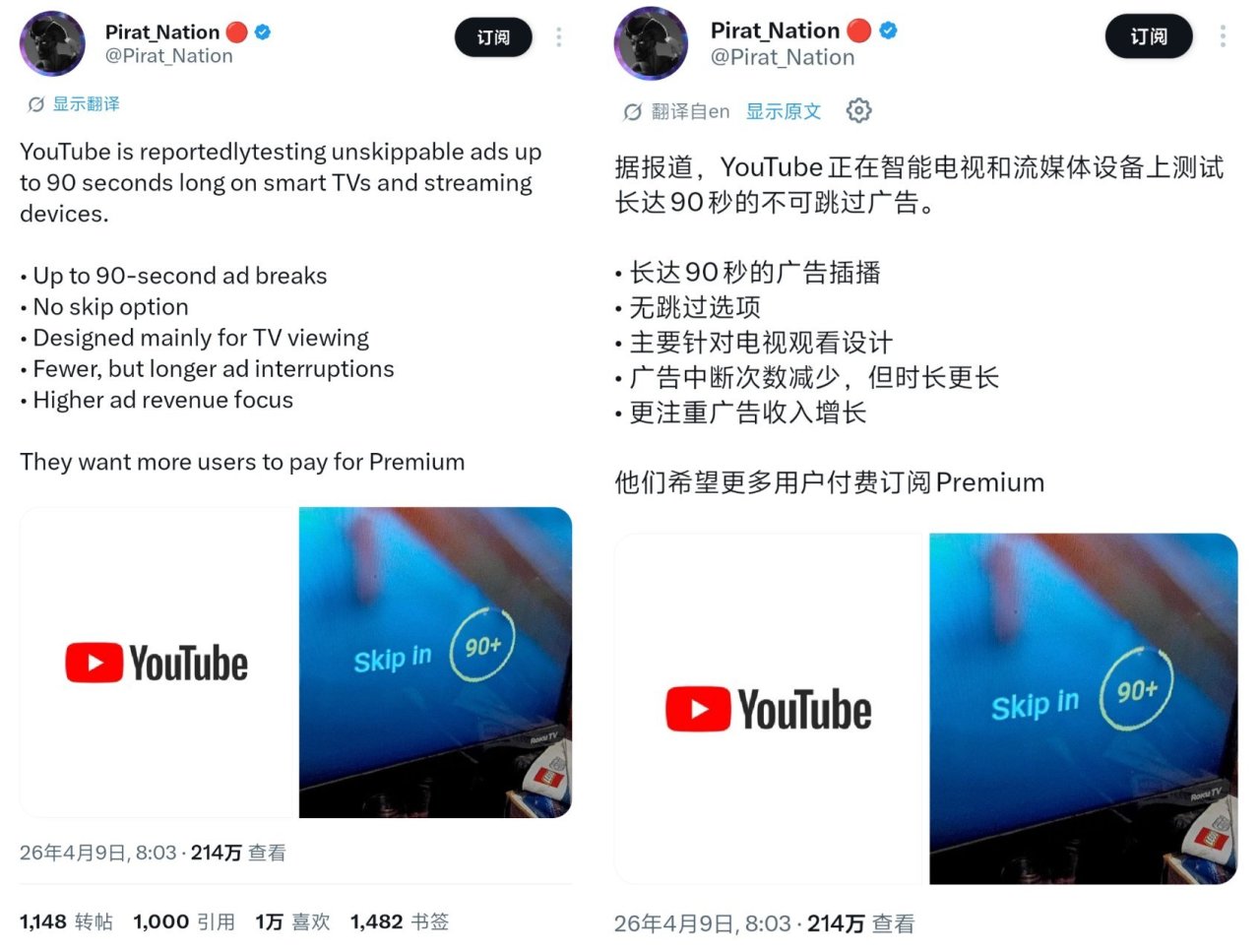 如題,YouTube之前不是偷摸測試90s的長廣告嗎: