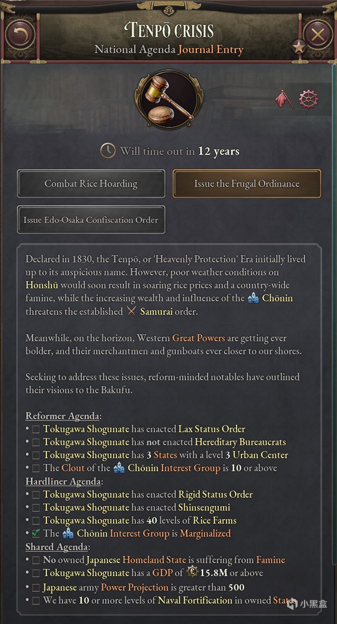 天保危機是日本的全新開局日誌條目,它聚焦於19世紀早期日本在政治、經濟與外交領域所經歷的動盪——簡單來說,內憂外患。此日誌條目要求你按照要求完成“改革派”與“強硬派”陣營議程上的各項任務。完成任務將提供獎勵,獎勵會根據更受青睞的一方而動態變化。一旦改革失敗,大衆對幕府的信心將進一步下降,倒幕派將更有信心、更有膽量,也更強大。