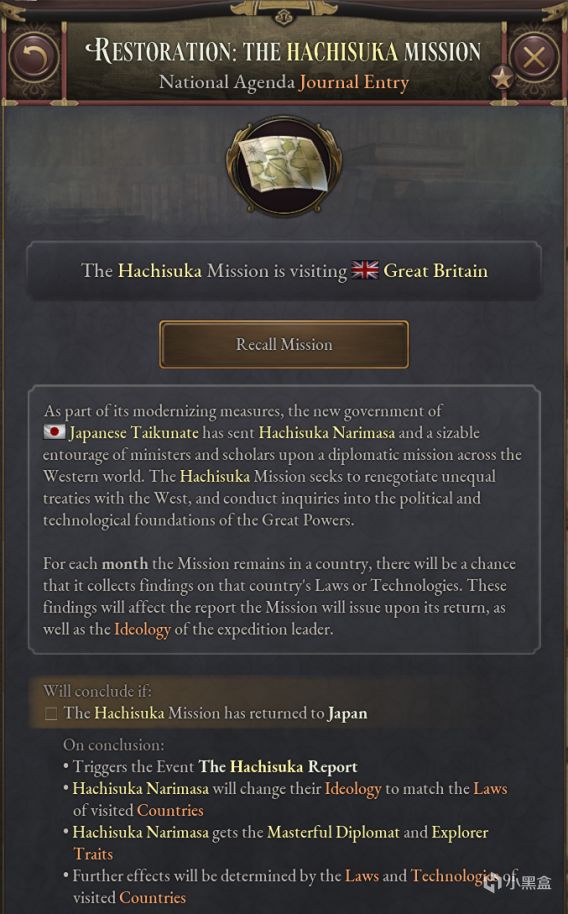 使用決議遣外使節團後,你可以選擇由誰帶領使團。隨後,使節團將橫跨大洋,先後前往美國與歐洲。當使節團位於某個國家時,它將收集對應國家法律與科技的相關信息。如果一個國家法律引人或引領科技,你可能希望使節團在那裏多停留些時間。