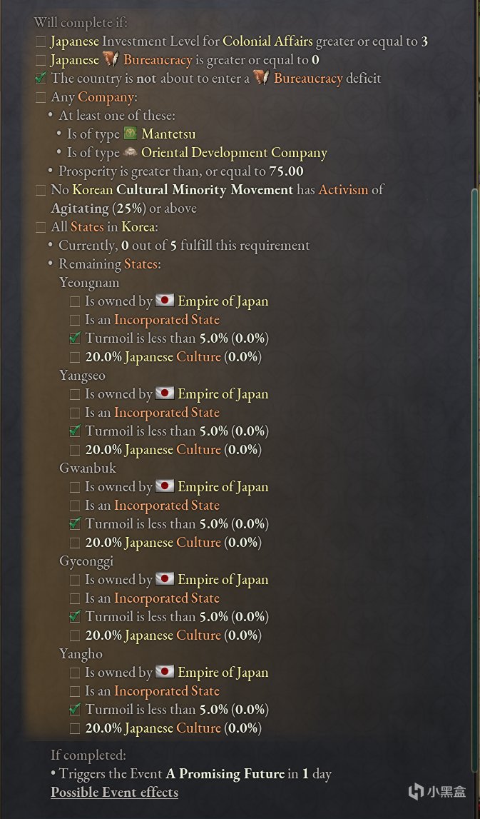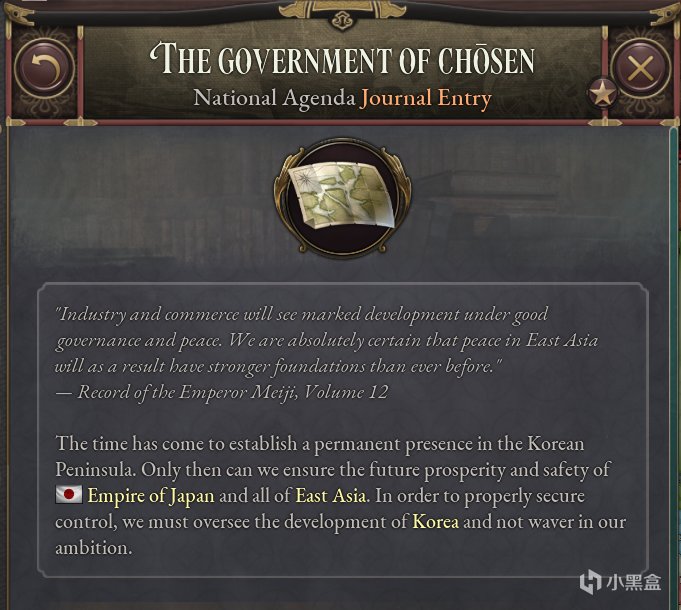 若想完成此日誌條目,你需要通過發展殖民公司、核心化地區、降低地區動亂與朝鮮民族運動活躍度、同化當地人口,確立對朝鮮的牢固控制。完成對朝鮮的殖民將爲在此過程中發揮作用的公司帶來巨大利益,並提升日本的威望。
