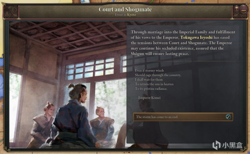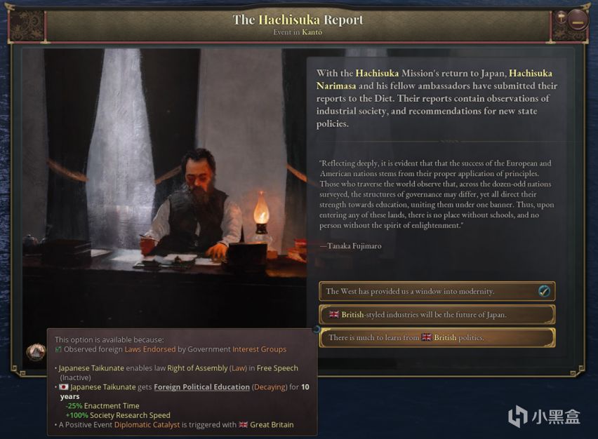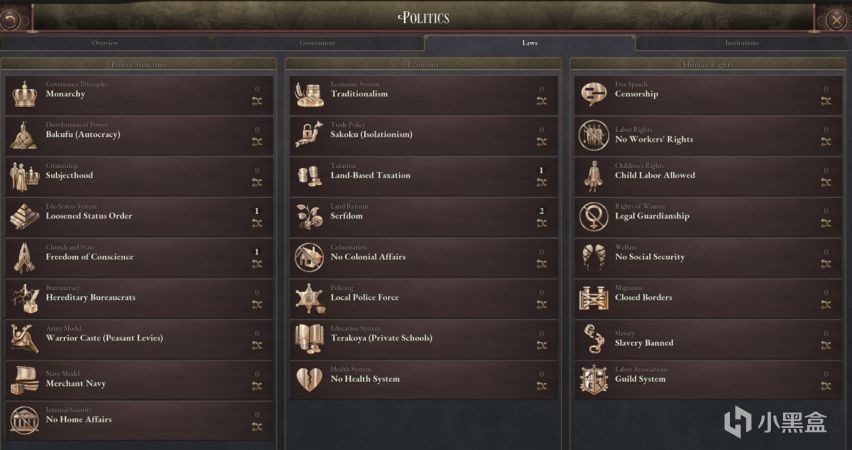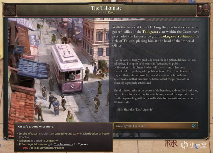 大家好,我是大老Victoria,今天我將介紹日本開局時的政治形勢,以及經過改進的全新天皇親政進程。請注意,敘事內容中明治維新及之前的內容將對所有玩家可用,而天保危機及之後的內容則包含於擴展包The Great Wave中。