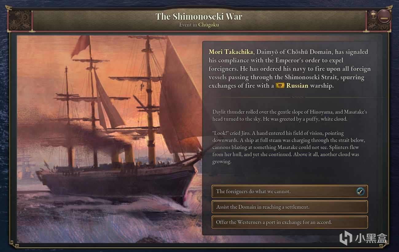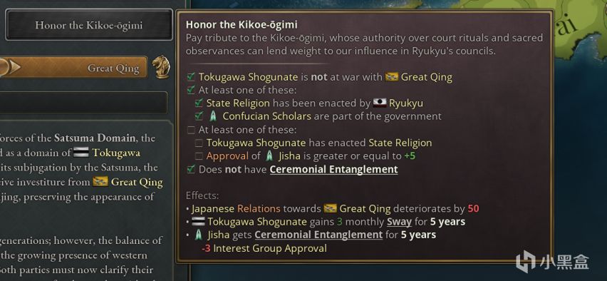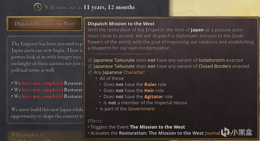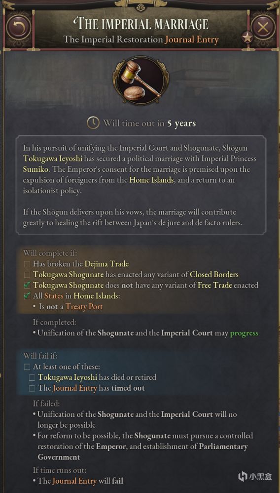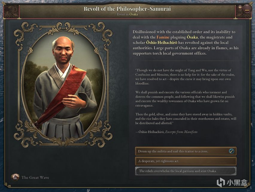 在該日誌條目生效期間,你將收到與政治動亂相關的各種事件,如著名的大鹽平八郎起義、幕府爲抵禦外國侵犯所做的早期嘗試等。