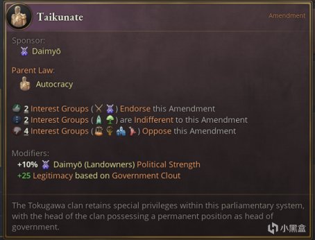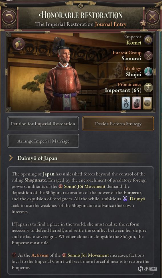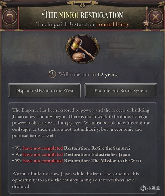 幕府被推翻、天皇重掌大權之後,日本將進入一段快速改革、充滿機遇的時期。我們將部分原有的的明治維新內容糅進了此日誌條目,併爲玩家提供了探索新政治格局、瓦解舊有體制的機會。