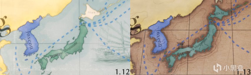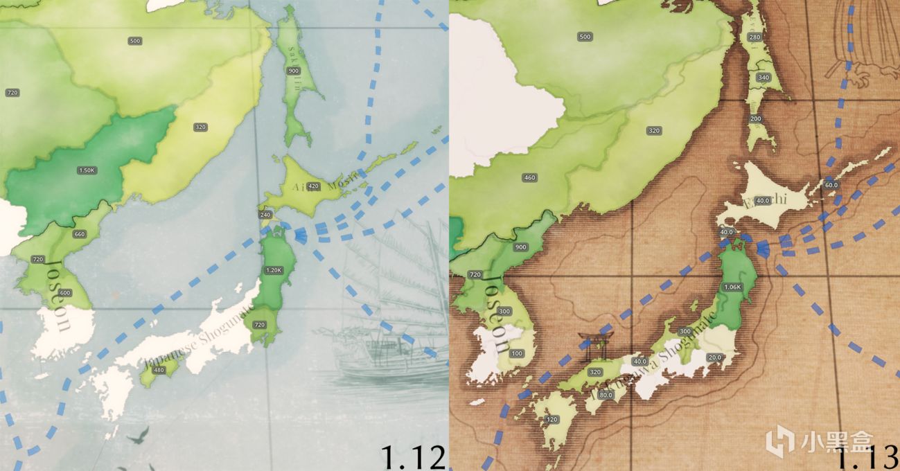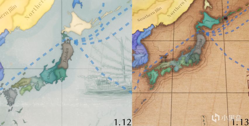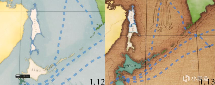 在北方,我們對後來被稱爲北海道的蝦夷島做了一些進一步的調整。首先,千島羣島已併入薩哈林州地區,此前它們分別屬於北海道和堪察加半島。這樣一來,日本和俄羅斯對該地區的最大領土野心都能實現。動態命名會根據您擁有薩哈林、千島羣島或兩者的情況,更改您在此地所擁有州的名稱。儘管幕府規定日本人禁止永久定居於和人地以北,但日本在該區域的影響力與控制力比較可觀,日本駐軍、行政官員與商人廣泛存在。北千島羣島則被視爲俄美公司領土,而烏魯普島、擇捉島之間的弗里斯海峽是日俄行政區域的邊界。