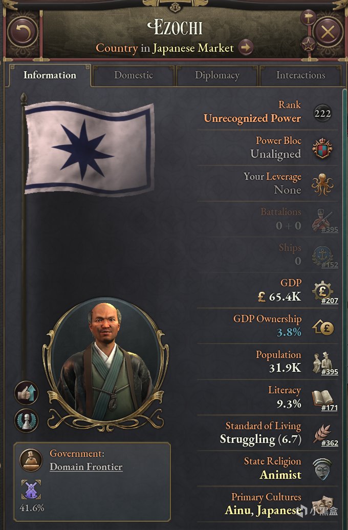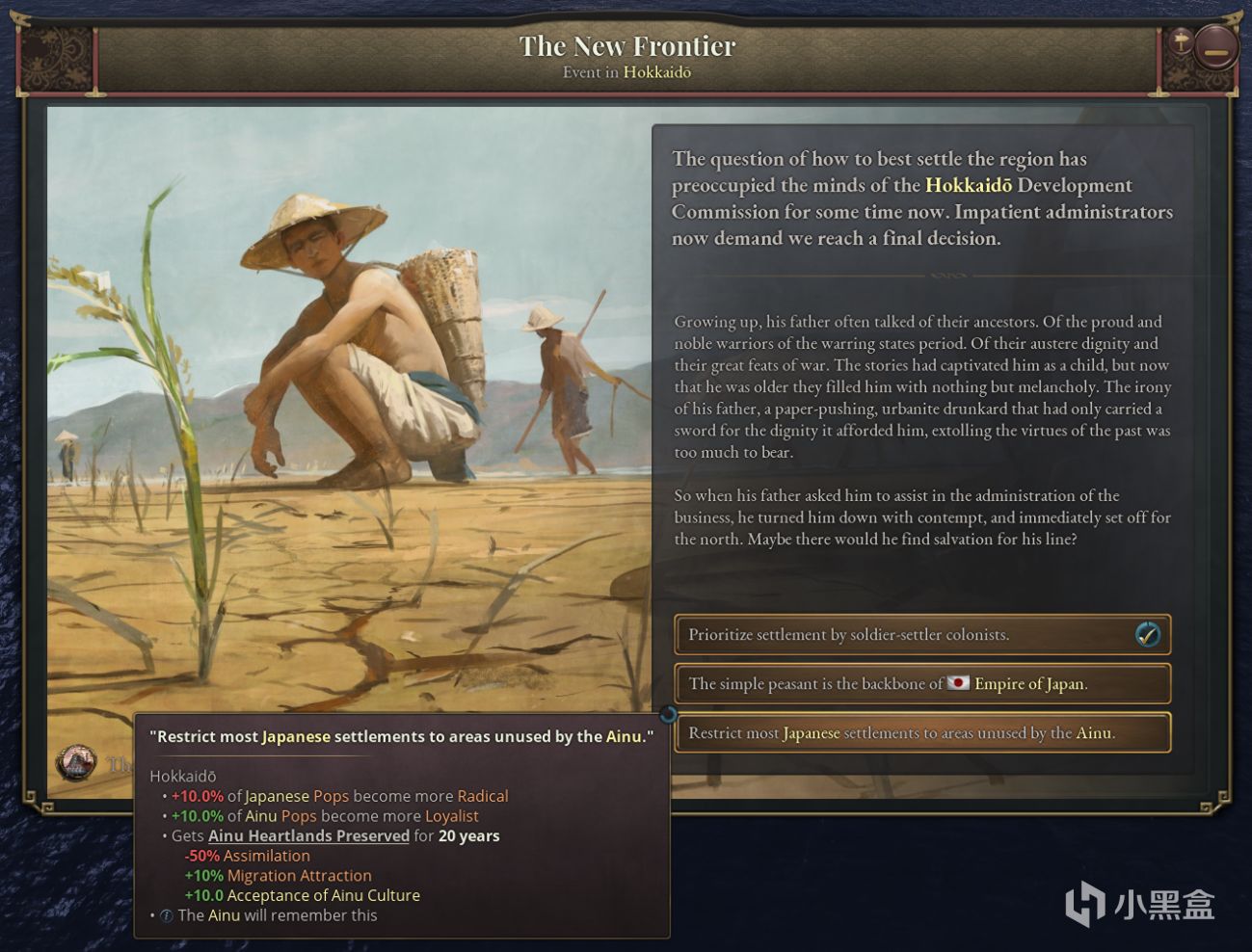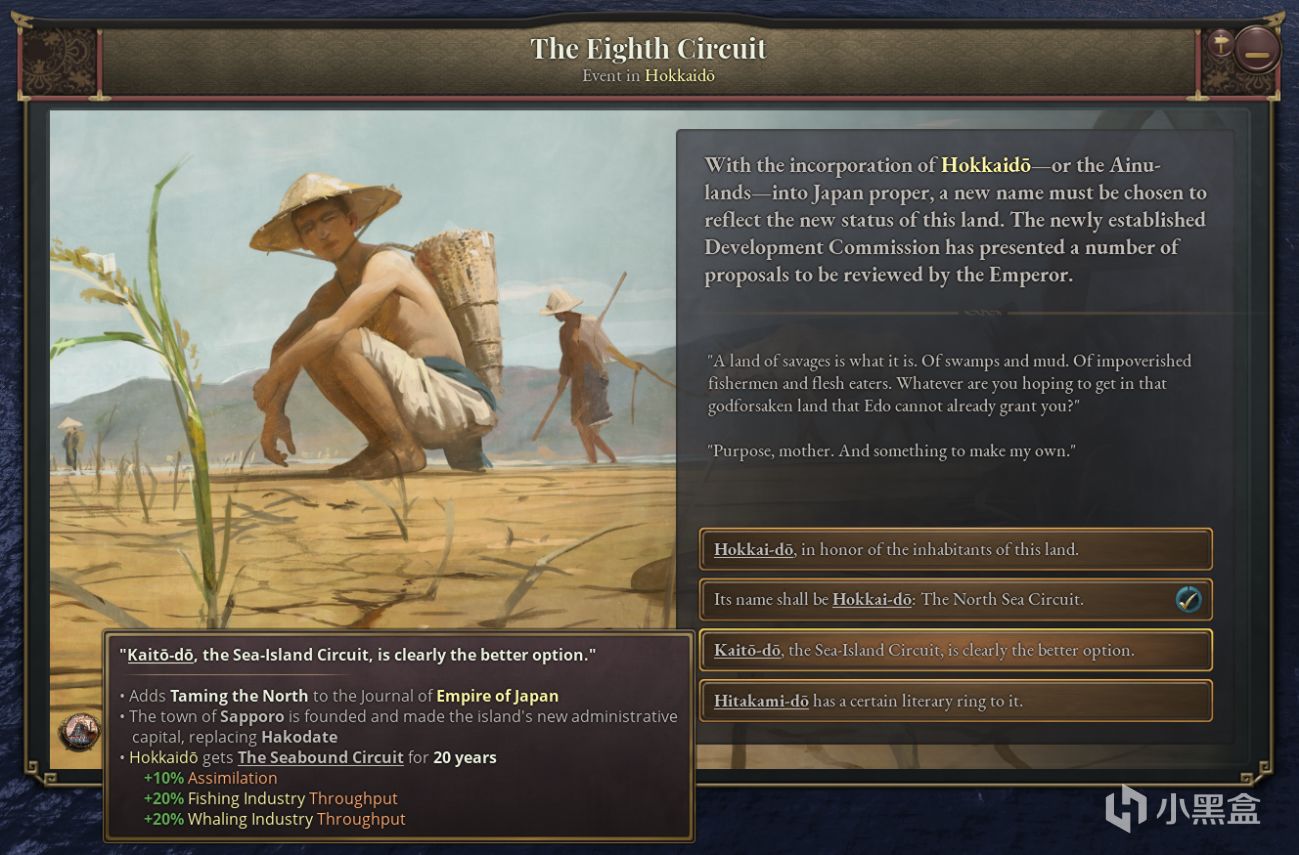 大量時間與成本將被投入,但假以時日,你將可以排幹並開發蝦夷島、增加可用耕地面積、引入水稻或其他經濟作物、吸引來自南方的移民前來定居。你做出的決定將影響你與土著阿伊努人的關係——主要是負面的——但或許有空間做出一些讓步?