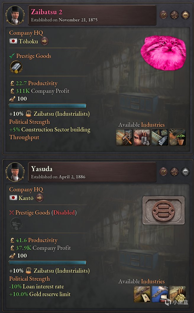 The Great Wave擴展包添加了全新公司,使日本能夠同時擁有至多四個歷史上的財閥。各財閥之間通常不會相互競爭,因此,若玩家選擇成立多個財閥,經濟增長的成果將被它們瓜分。此外,財閥的繁榮度獎勵將賦予實業家政治力量,繁榮的財閥成爲其政治代表的巨大助力。