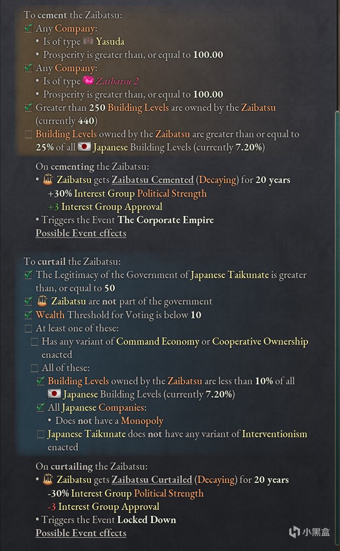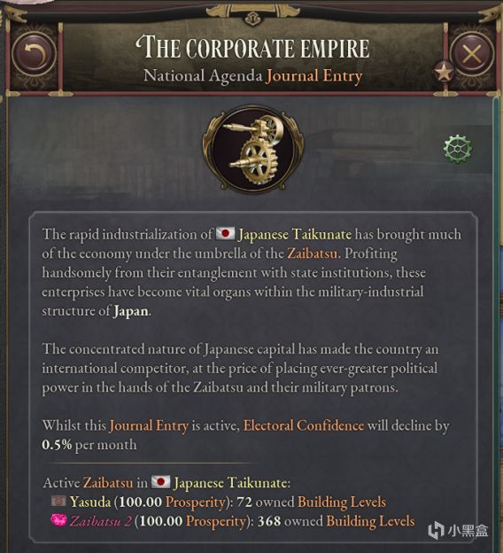 在日誌條目企業帝國中,你將從繼續延續國家與財閥之間富有成效的合作關係與遏制這些壟斷集團的力量中做出選擇。遏制財閥權力的方式有不同途徑——你可以強化中央力量,直至財閥無法施加有意義的政治影響力;亦可改變政策,迫使其與外國公司競爭,並通過施行經濟干預之外的經濟法律來削減其市場份額。