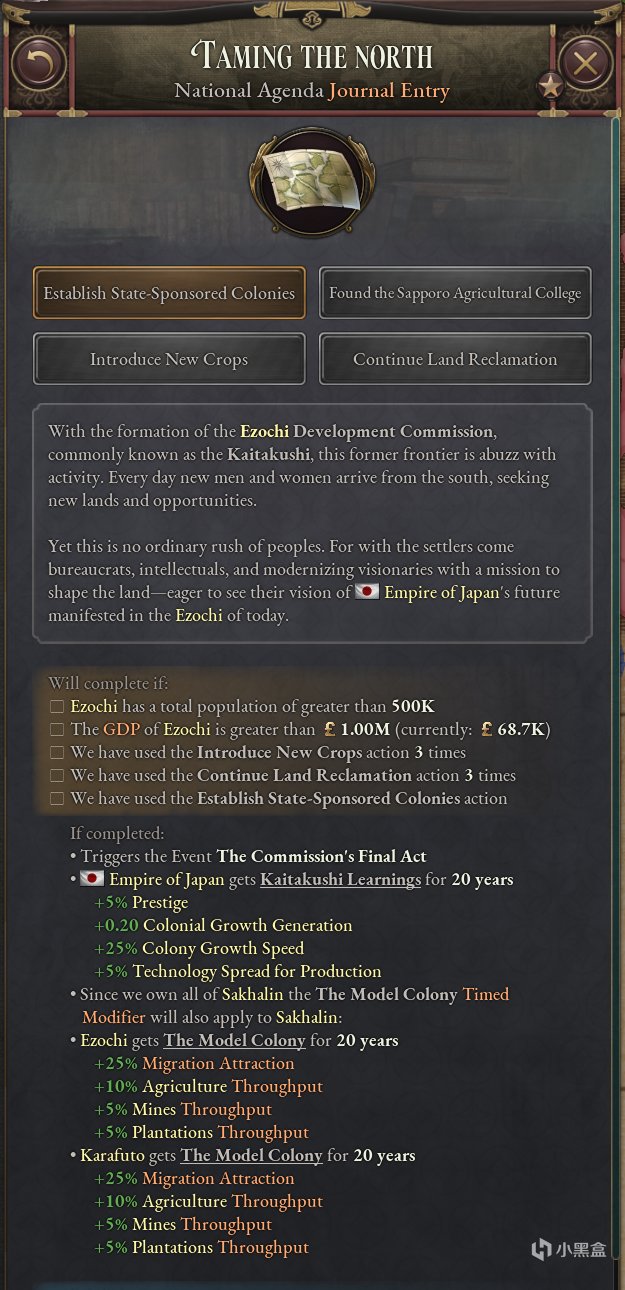 一旦蝦夷完全併入日本版圖並得到了初步開發,日誌條目馴服北部將會出現。在此日誌條目中,你需要將開發不足、人煙稀少、經濟潛力有限的不毛之地,發展爲在農業與工業產出上足以媲美南方鄰居的富庶地區