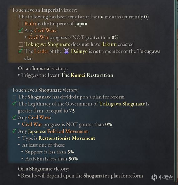 全面王政復古——歷史結局——代表着天皇權力的全面恢復。這一結局可通過兩種途徑實現:在幕府正統性低時上表請求王政復古,或通過常規法律制定程序廢除法律幕府。這條路線同樣極易引發內戰——歷史上,戊辰戰爭因此爆發。