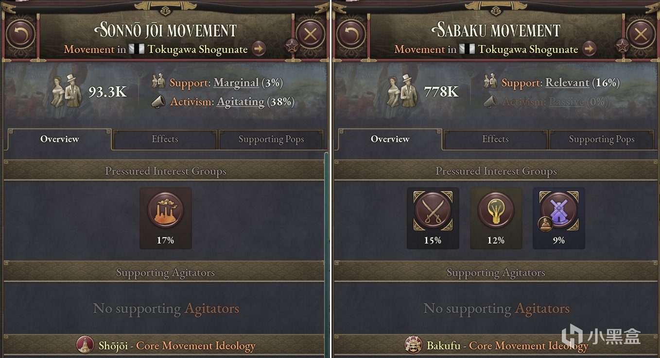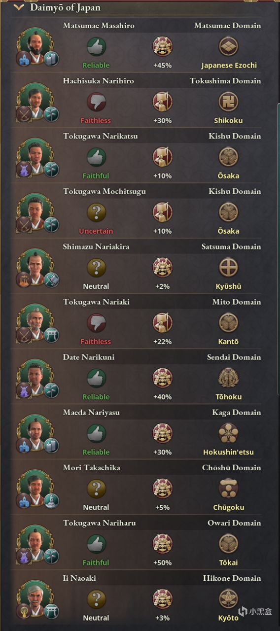 固有社會基礎並非兩股運動尋求支持者的唯一途徑。各藩所在地區的大名忠誠度,會爲其偏好的運動提供強有力的修正——一位極其不忠誠的大名將使其所在地區強烈傾向尊王攘夷運動,而一位態度溫和的忠誠大名則會對佐幕運動略有助益。歷史上,此時日本共有二百餘個大名領地,但遊戲中,每個地區將被與其範圍內最富有(就“國庫”而言)、最具影響力的各藩關聯。