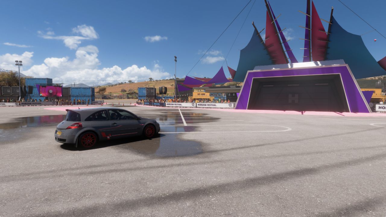 在地平线街景前哨站拍摄2008款雷诺 梅甘娜R26.R(锦标赛四奖励车辆),位置如图,完成奖励为“西瓜踝袜”服饰奖励