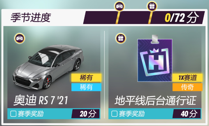冬季赛20分进度奖励为2021款奥迪 RS 7 Sportback和40分进度奖励为地平线后台通行证