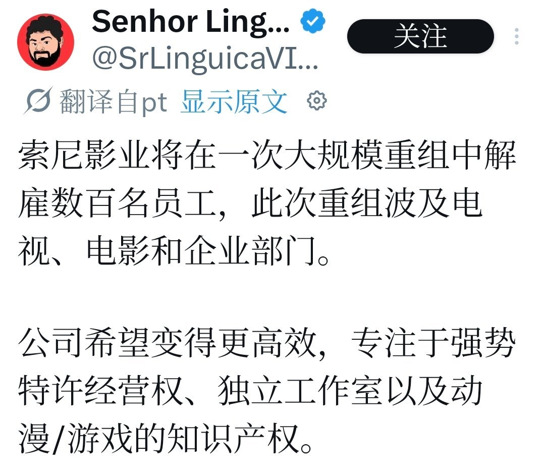 索尼影業正在經歷裁員和重組,這是一次典型的“好萊塢式戰略瘦身”,本質上是在後流媒體時代重新分配資源,把錢和人力從“過去賺錢但現在增長慢”的傳統影視業務,集中到“未來確定性更高”的遊戲IP改編和動漫賽道。