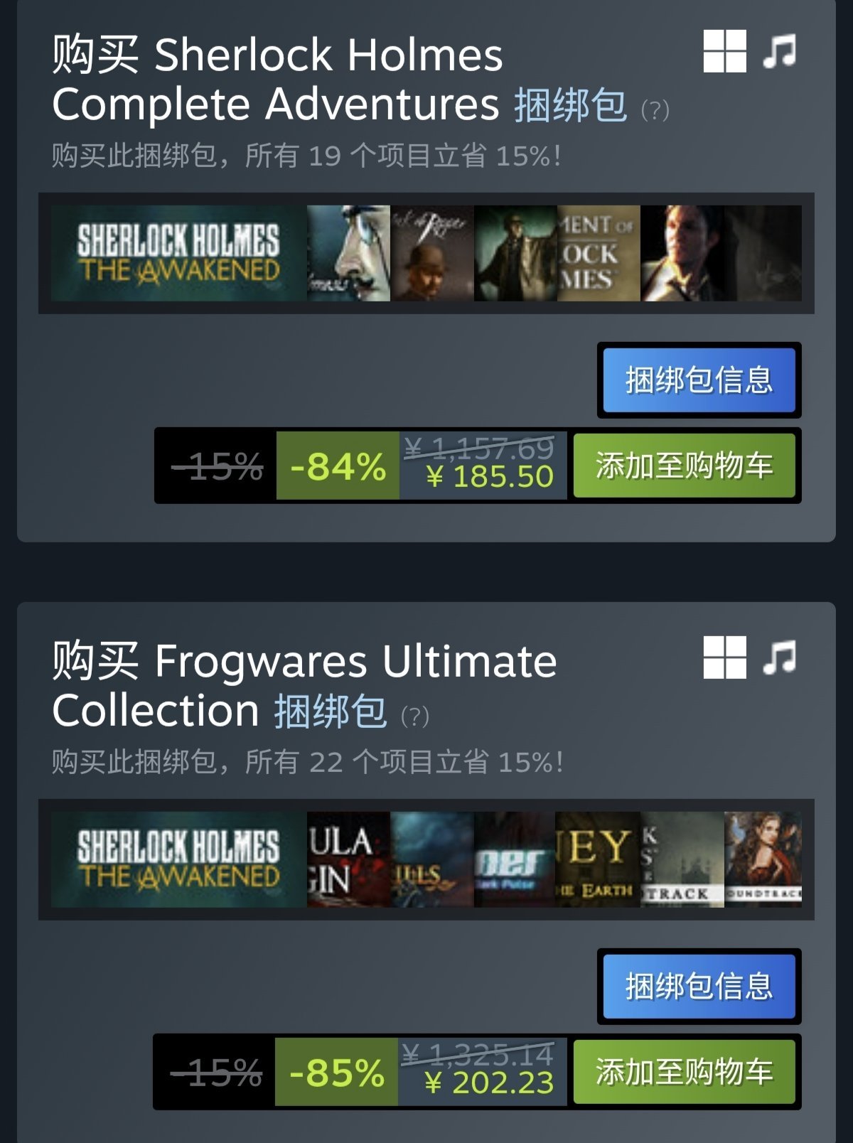 两个包区别不大,是福尔摩斯十一部游戏本体+全部剧情dlc+音乐包+美术集+皮肤包。