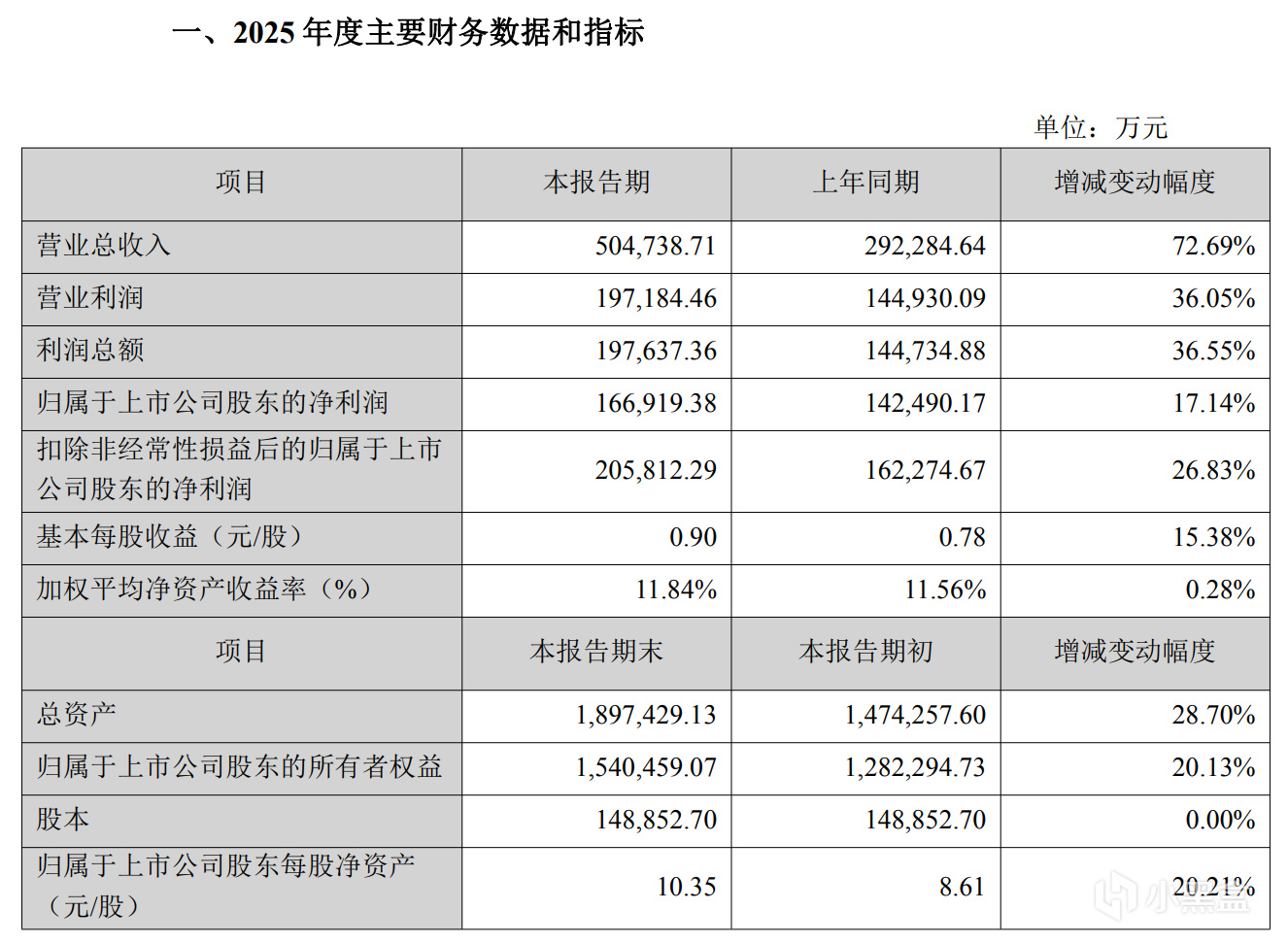 财报显示,2025年巨人网络实现营收50.47亿元,同比增长72%;净利润16.69亿元,同比增长17.14%;扣非净利润为20.58亿元,同比增长26.83%。