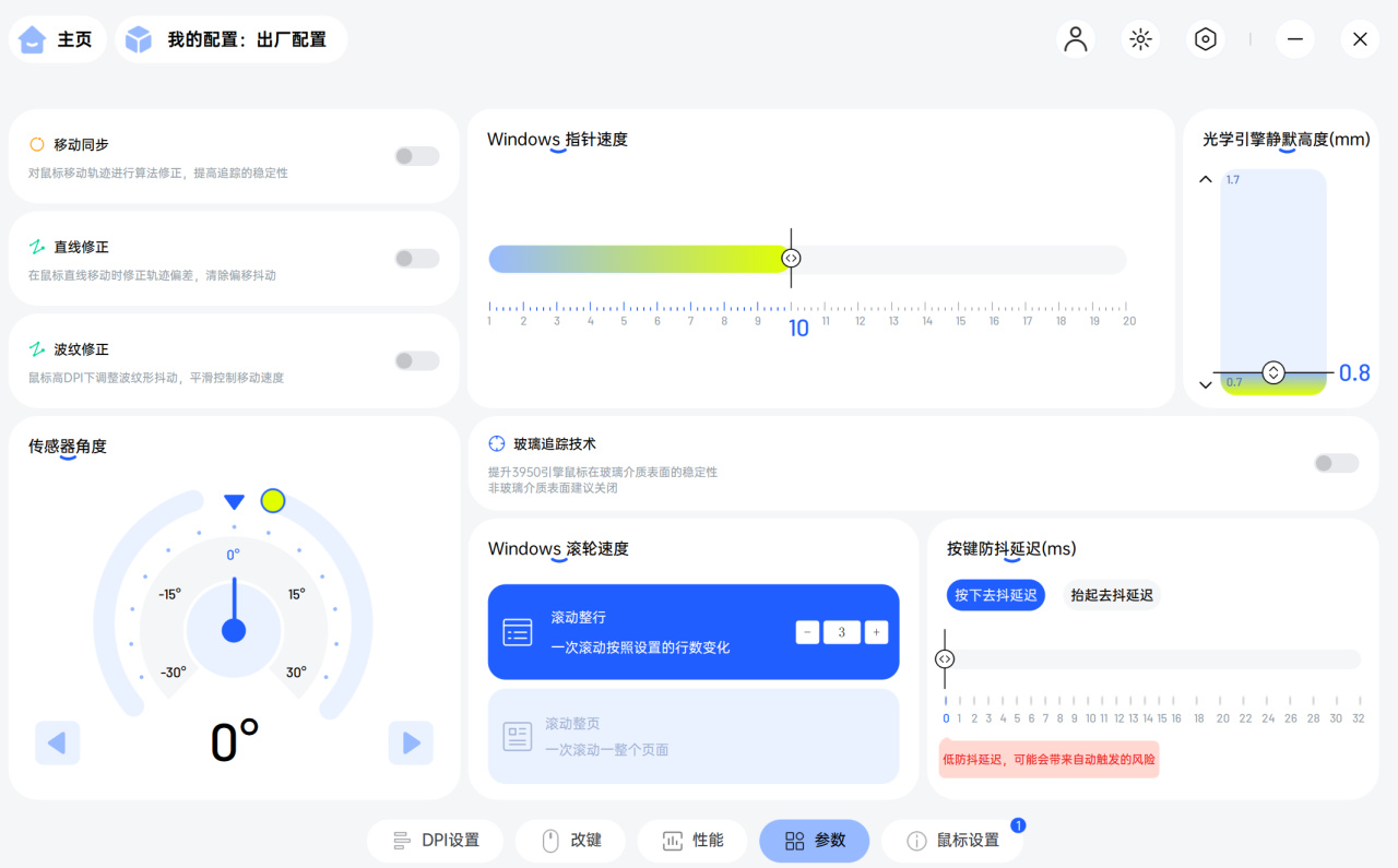 基本上什么功能都有,你想调什么都能调,而且很方便。我目前用下来,这是绝对的国产鼠标里T0的离线驱动了