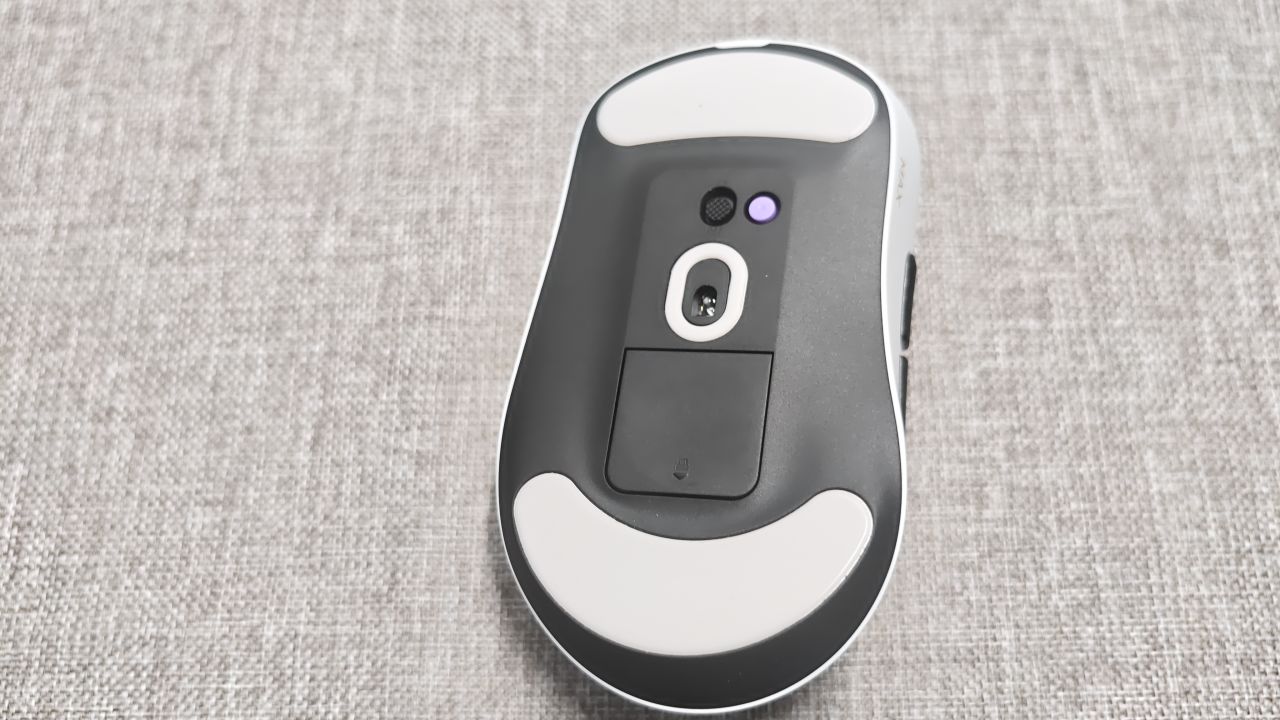 紫色的那个按键是回报率切换,回报率切换的旁边是开关按钮 光头的下方是接收器收纳仓。总体来说该有的都有,物理按键也给的很到位,没有因为驱动用的多,就把物理按键砍了,这点要给好评
