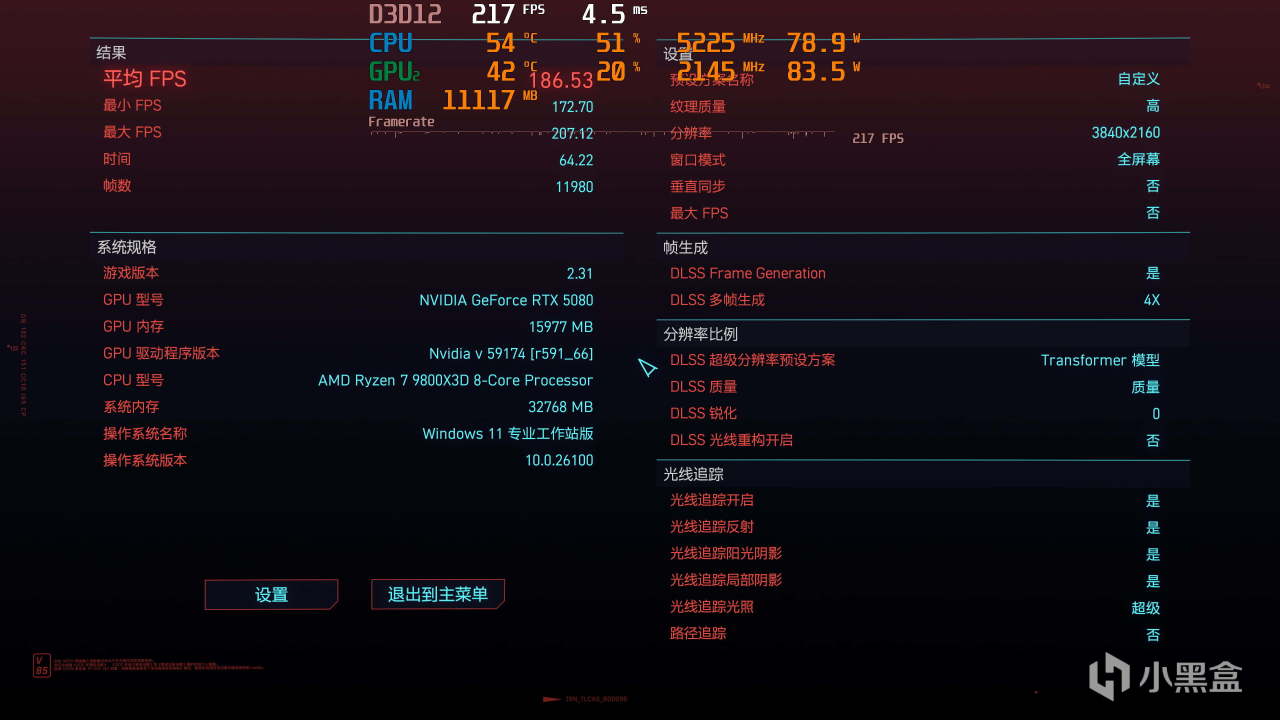 《赛博朋克2077》4K极端画质+DLSS质量+光追超级的情况下,能跑到186帧。