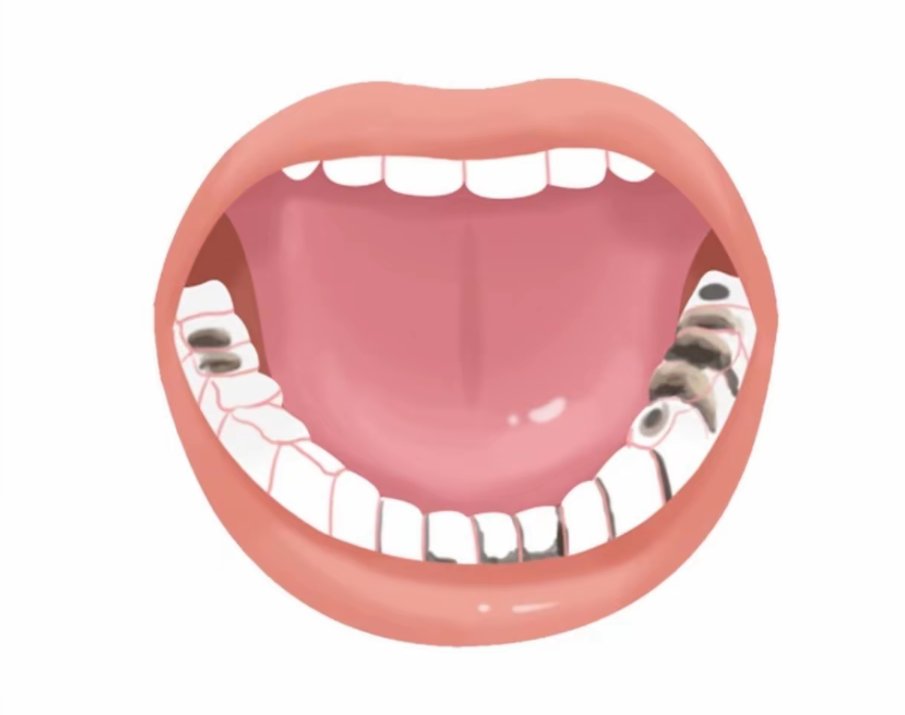 第二步,中龋发展为深龋,细菌进一步入侵,接近牙髓腔,牙齿出现明显黑洞,进食时食物嵌塞会引发剧烈疼痛,牙齿咀嚼功能下降,