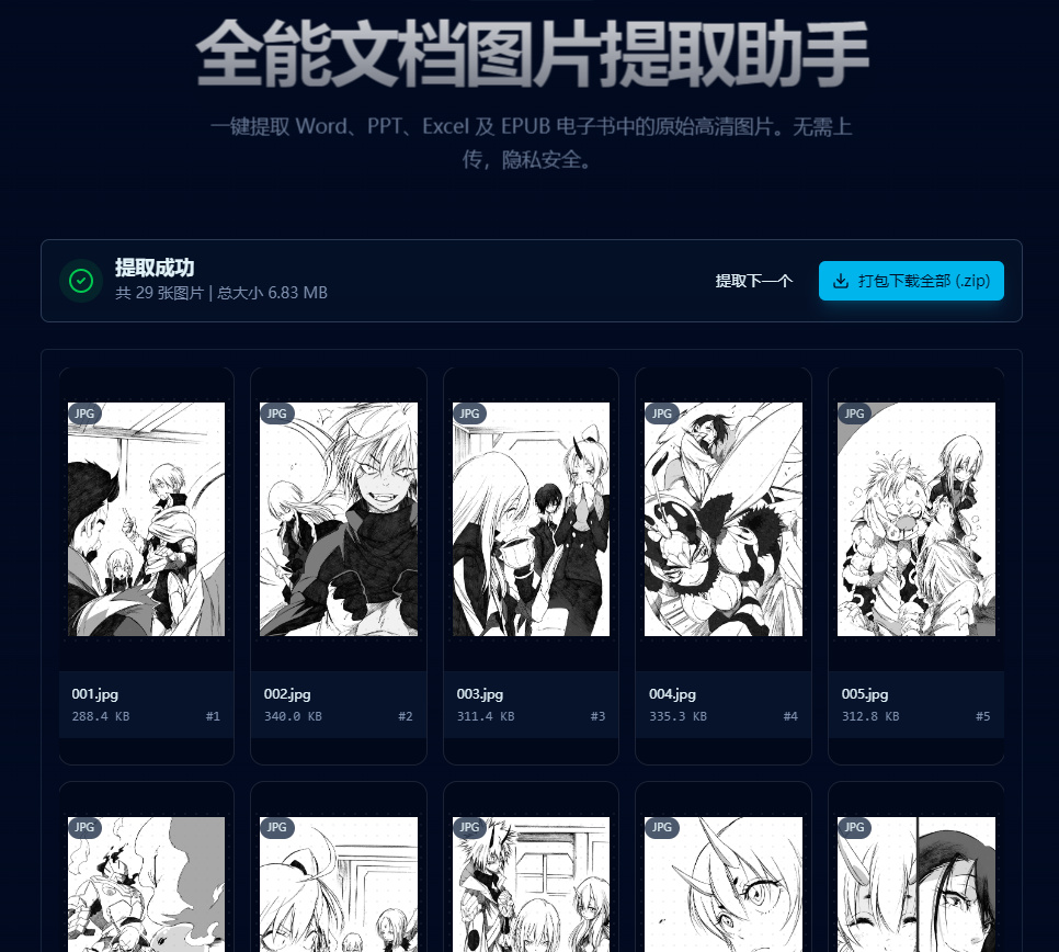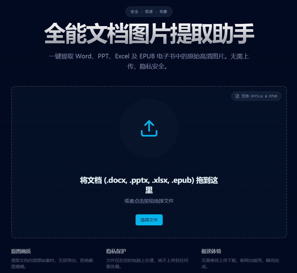 支持从 Word、PPT、Excel、EPUB 文档中一键提取原始图片,全程在浏览器本地处理,文件不上传服务器,离线也能用。