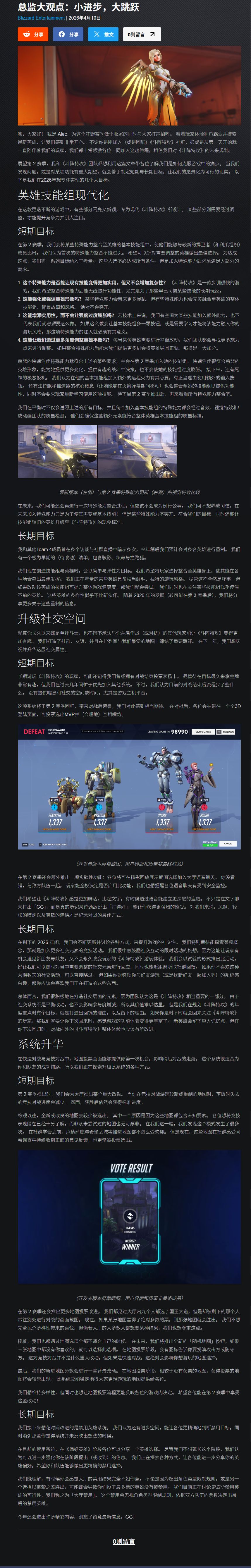 今日,《守望先锋》游戏总监 Alec 发布 2026 年游戏发展核心规划,围绕英雄技能迭代、社交空间升级、对局系统优化三大核心方向,披露第 2 赛季的重磅更新内容与全年长期开发目标,向玩家公布游戏后续的优化与革新路径。