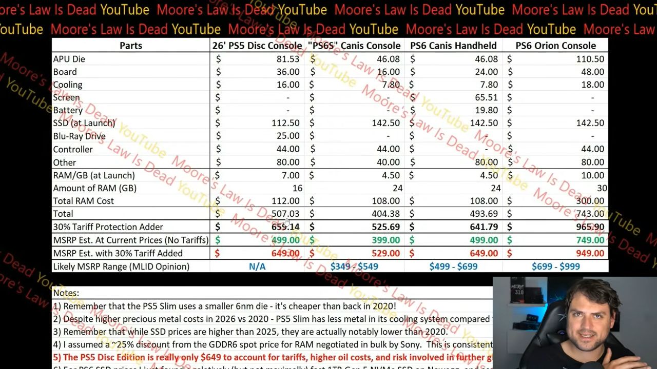 在最新一期视频中,知名频道"摩尔定律已死"(Moore's Law is Dead)深入剖析了PS6硬件的预估物料清单,并与PS5 Slim进行了对比分析。