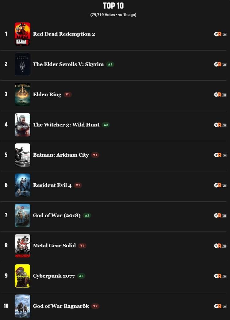 《荒野大鏢客 2》 是有史以來最好的遊戲,其次是 Bethesda 的開放世界史詩鉅作《上古卷軸 5: 天際》 、FromSoftware 的 《艾爾登法環》 、規模宏大的奇幻角色扮演遊戲 《巫師 3:狂獵》 、超級英雄動作冒險遊戲 《蝙蝠俠:阿卡姆之城》 、開創性的動作恐怖遊戲 《生化危機 4》 、2018 年的 《戰神》 遊戲、小島秀夫的 《合金裝備》 、CD Projekt Red 的 《賽博朋克 2077》 ,最後是備受讚譽的 2018 年 《戰神》遊戲的續作《戰神: 諸神黃昏》 。
