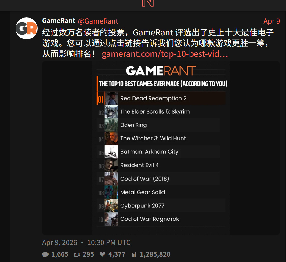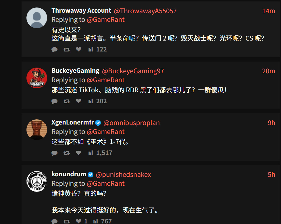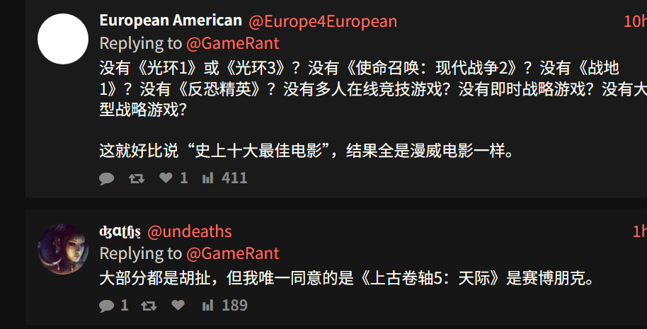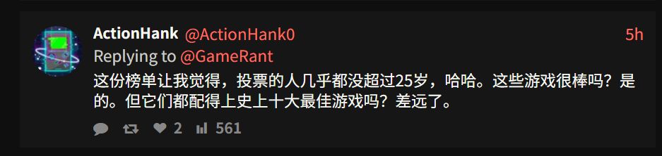 然而,這份由於現代作品佔據絕對主導地位的名單在社交媒體上引發了劇烈討論。其中,用戶thedarkbiden發表了“GameRant的讀者可能全都是在過去十年裏出生的”內容,直指參與投票的玩家羣體過於年輕,缺乏對遊戲史早期經典作品的認知,這一觀點迅速引起熱議。