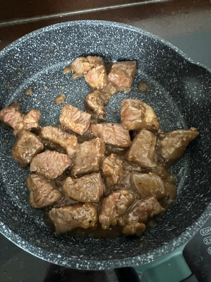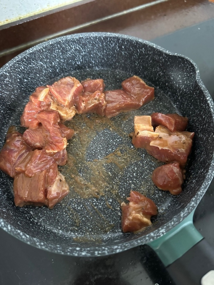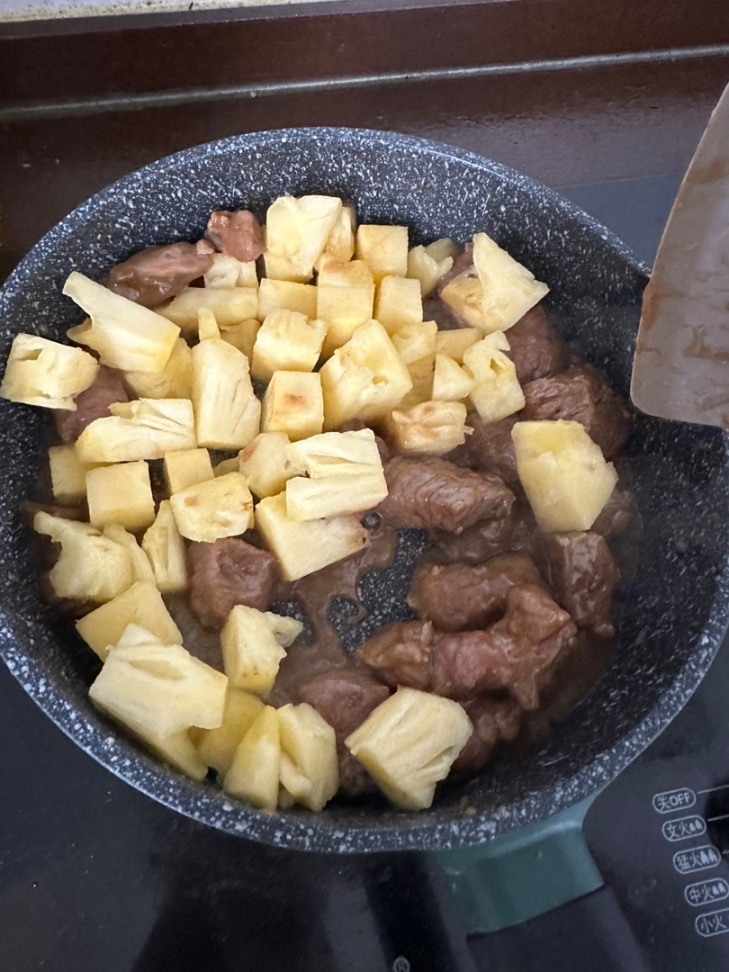 3.起锅烧油,油少少少放!!!!!!加入牛肉炒至变色加入菠萝