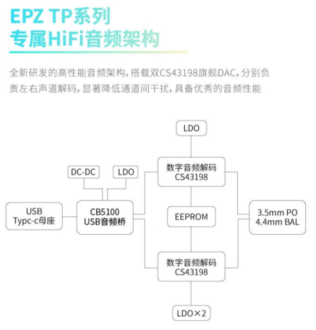 核心是搭载了双Cirrus Logic CS43198 DAC芯片,左右声道各配备一颗,实现独立解码;CS43198芯片的优势是低失真+高信噪比,能够有效还原音频细节,减少失真,让音质更加纯净自然。