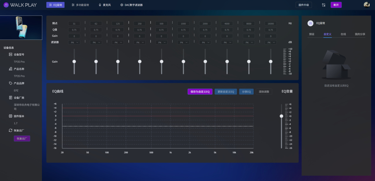 这里单拿APP来说,Walk Play里面的功能很丰富,包括5种数字滤波模式、8种预设EQ、麦克风增益调节、DAC工作模式选择、高低增益切换等,能够满足不同玩家的听音喜好和需求,在这些功能里面:
