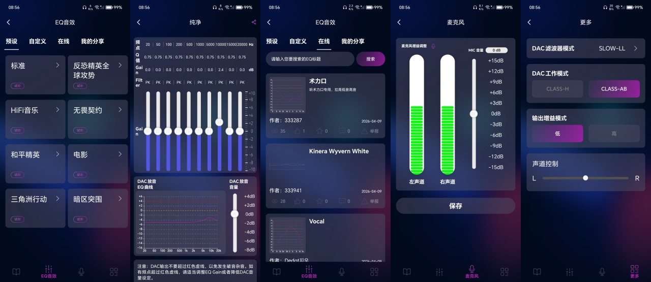 软件功能丰富:支持APP与网页端双端控制,多种EQ、数字滤波可选,自定义程度高。
