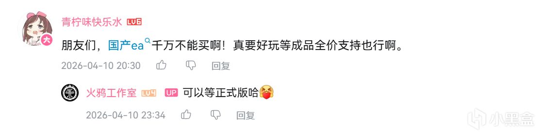 很多人的獨立遊戲夢想本不應該經受羣嘲和踐踏,對於EA階段的遊戲,我覺得不喜歡就不買,畢竟正式版的內容更多更全,可以一口氣玩到結束也不會有跑路的風險。