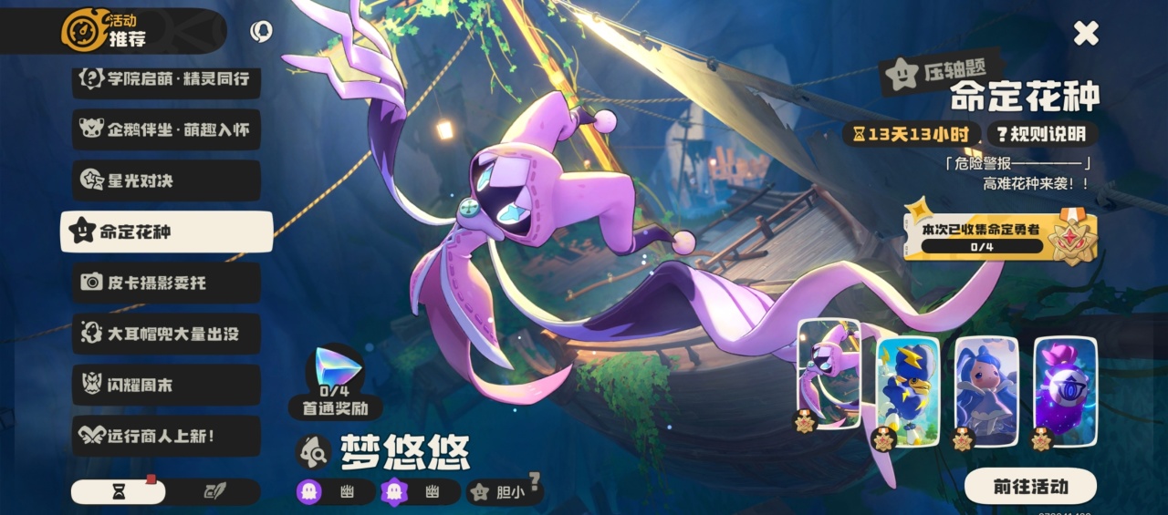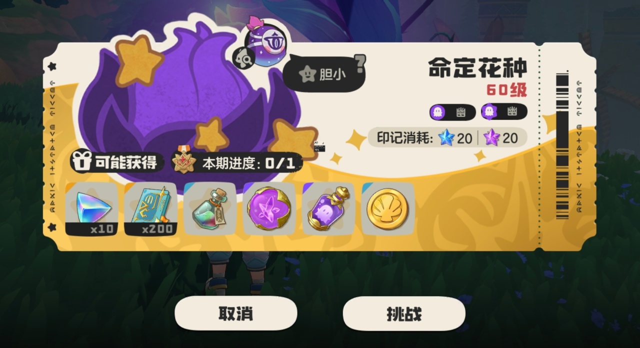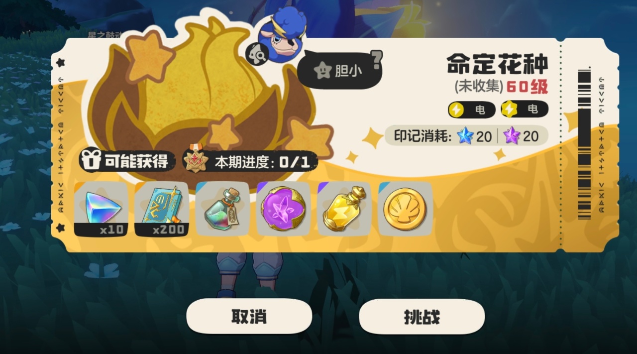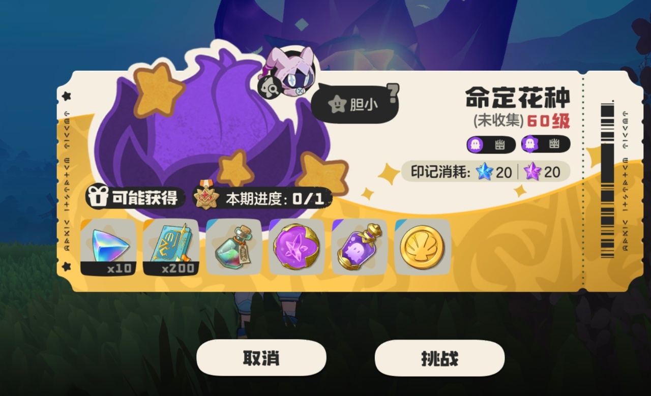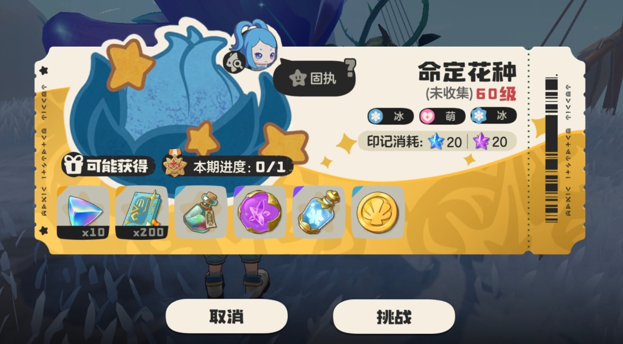 4只BOSS及固定性格:本期花种为雪影娃娃(固执)、梦悠悠(胆小)、电球咩咩(胆小)、幽冥瞑(胆小),每个BOSS的性格和天分(了不起天分)都是固定的。